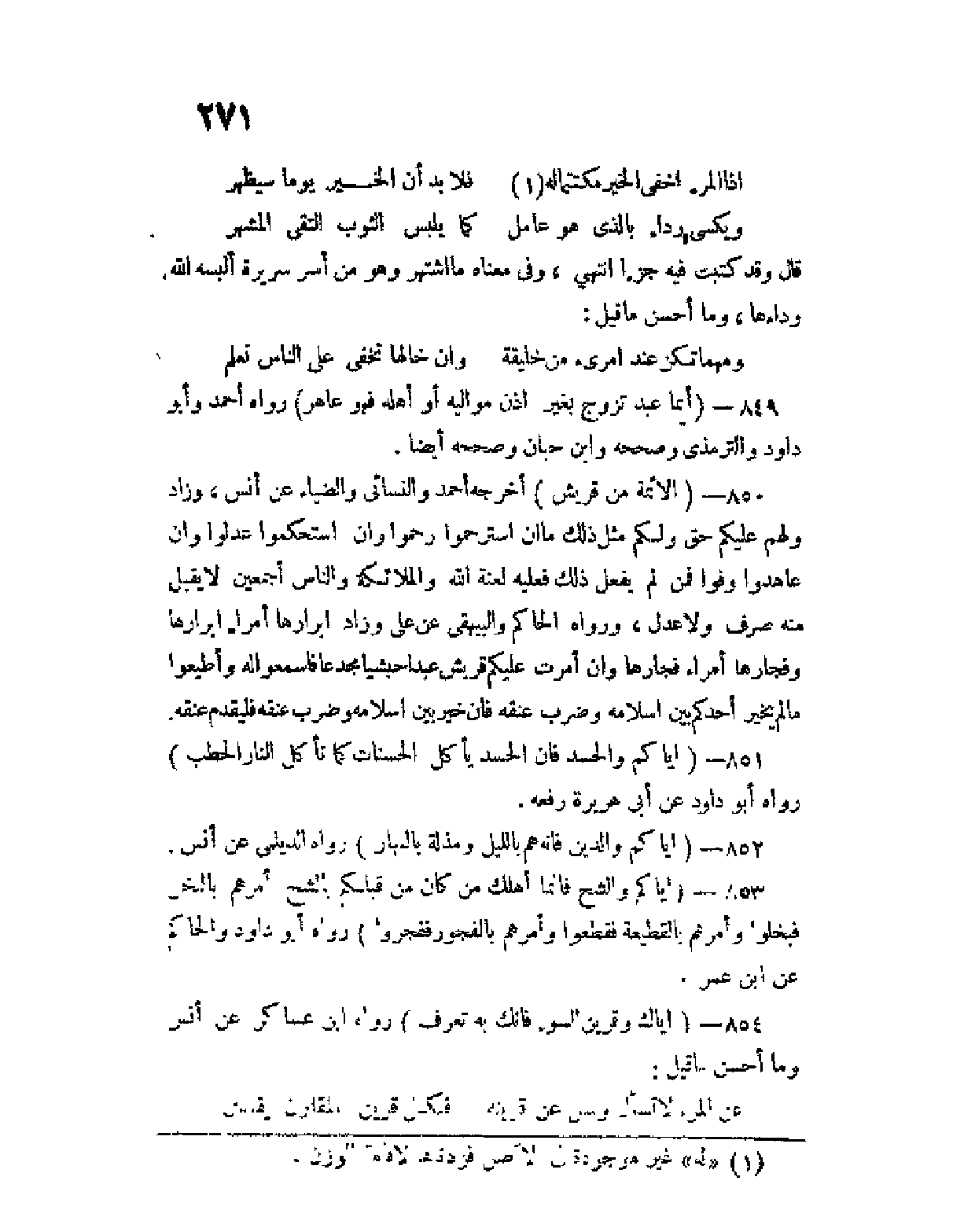 850 - (الأئمة من قريش) أخرجه أحمد والنسائي والضياء عن أنس، وزاد ولهم عليكم حق ولكم مثل ذلك ما إن استرحموا رحموا وإن استحكموا عدلوا وإن عاهدوا وفوا فمن لم يفعل ذلك فعليه لعنة الله والملائكة والناس أجمعين لا يقبل منه صرف ولا عدل، ورواه الحاكم والبيهقي عن علي وزاد أبرارُها أمراء أبرارِها وفجارُها أمراء فجارِها وإن أمرت عليكم قريش عبدا حبشيا مجدَّعاً فاسمعوا له وأطيعوا ما لم يُخَيَّر أحدكم بين إسلامه وضرب عنقه فإن خُيّرَ بين إسلامه وضرب عنقه فليقدم عنقه.