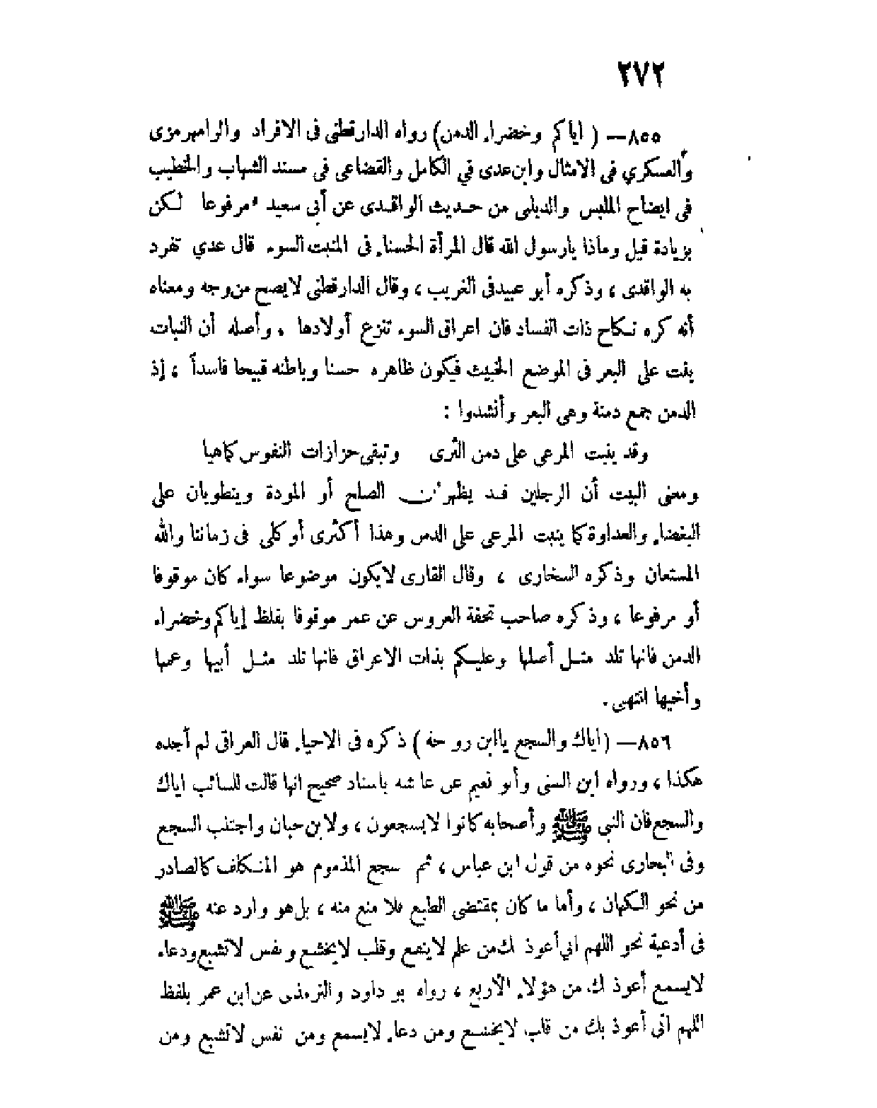 856 - (إياك والسجع يا ابن رواحة) ذكره في الإحياء قال العراقي لم أجده هكذا، ورواه ابن السني وأبو نعيم عن عائشة بإسناد صحيح أنها قالت للسائب إياك والسجع فإن النبي صلى الله عليه وسلم وأصحابه كانوا لا يسجعون، ولابن حبان واجتنب السجع وفي البخاري نحوه من قول ابن عباس، ثم السجع المذموم هو المتكلف كالصادر من نحو الكهَّان، وأما ما كان بمقتضى الطبع فلا منع منه، بل هو وارد عنه صلى الله عليه وسلم في أدعية نحو اللهم إني أعوذ بك من علم لا ينفع وقلب لا يخشع ونفس لا تشبع ودعاء لا يسمع أعوذ بك من هؤلاء الأربع، رواه أبو داود والترمذي عن ابن عمر بلفظ اللهم إني أعوذ بك من قلب لا يخشع ومن دعاء لا يسمع ومن نفس لا تشبع ومن