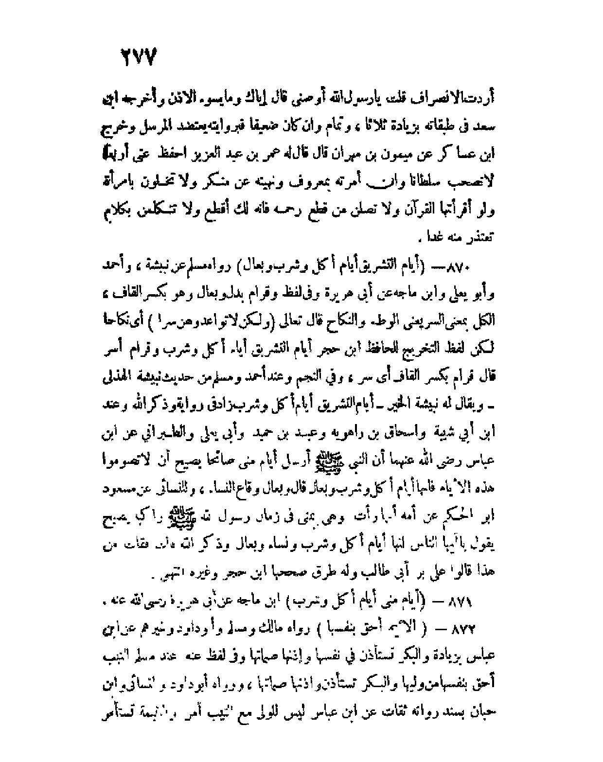870 - (أيام التشريق أيام أكل وشرب وبعال) رواه مسلم عن نُبيشة، وأحمد وأبو يَعلى وابن ماجه عن أبي هريرة وفي لفظٍ وقِرامٍ بدلَ وبِعال وهو بكسر القاف، الكل بمعنى السر يعني الوطء والنكاح قال تعالى ... (ولكن لا تواعدهن سرا) ... أي نكاحا لكن لفظ التخريج للحافظ ابن حجر أيام التشريق أيام أكل وشرب وقرام أسر قال قرامٌ بكسر القاف أي سر، وفي النجم وعند أحمد ومسلم من حديث نبيشة الهُذلي - ويقال له نَبيشة الخير - أيام التشريق أيام أكل وشرب زاد في رواية وذكرِ الله وعند ابن أبي شيبة وإسحاق بن راهويه وعبد بن حميد وأبي يعلى والطبراني عن ابن عباس رضي الله عنهما أن النبي صلى الله عليه وسلم أرسل أيام منى صائحا يصيح أن لا تصوموا هذه الأيام فإنها أيام أكل وشرب وبعال قال وبعالٍ وِقاعِ النساء، وللنسائي عن مسعود ابن الحكم عن أمه أنها رأت وهي بمنى في زمان رسول الله صلى الله عليه وسلم راكبا يصيح يقول: يا أيها الناس إنها أيام أكل وشرب ونساء وبعال وذكر الله قالت فقلت: من هذا؟ قالوا: علي بن أبي طالب وله طرق صححها ابن حجر وغيره انتهى.