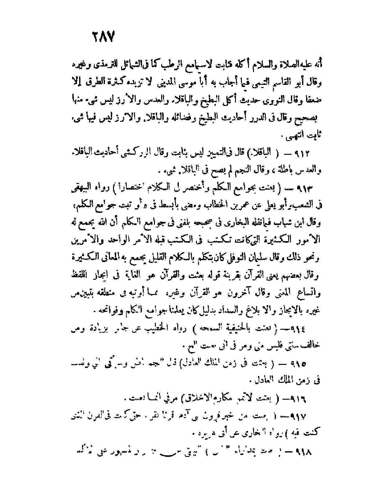 913 - (بعثت بجوامع الكلم، واختصر لي الكلام اختصاراً) رواه البيهقي في الشعب وأبو يعلى عن عمر بن الخطاب، ومضى بأبسط في " أوتيت جوامع الكلم " وقال ابن شهاب فيما نقله البخاري في صحيحه: بلغني في جوامع الكلم أن الله يجمع له الأمور الكثيرة التي كانت تكتب في الكتب قبله، الأمر الواحد والأمرين ونحو ذلك وقال سليمان النوفلي: كان يتكلم بالكلام القليل يجمع به المعاني الكثيرة