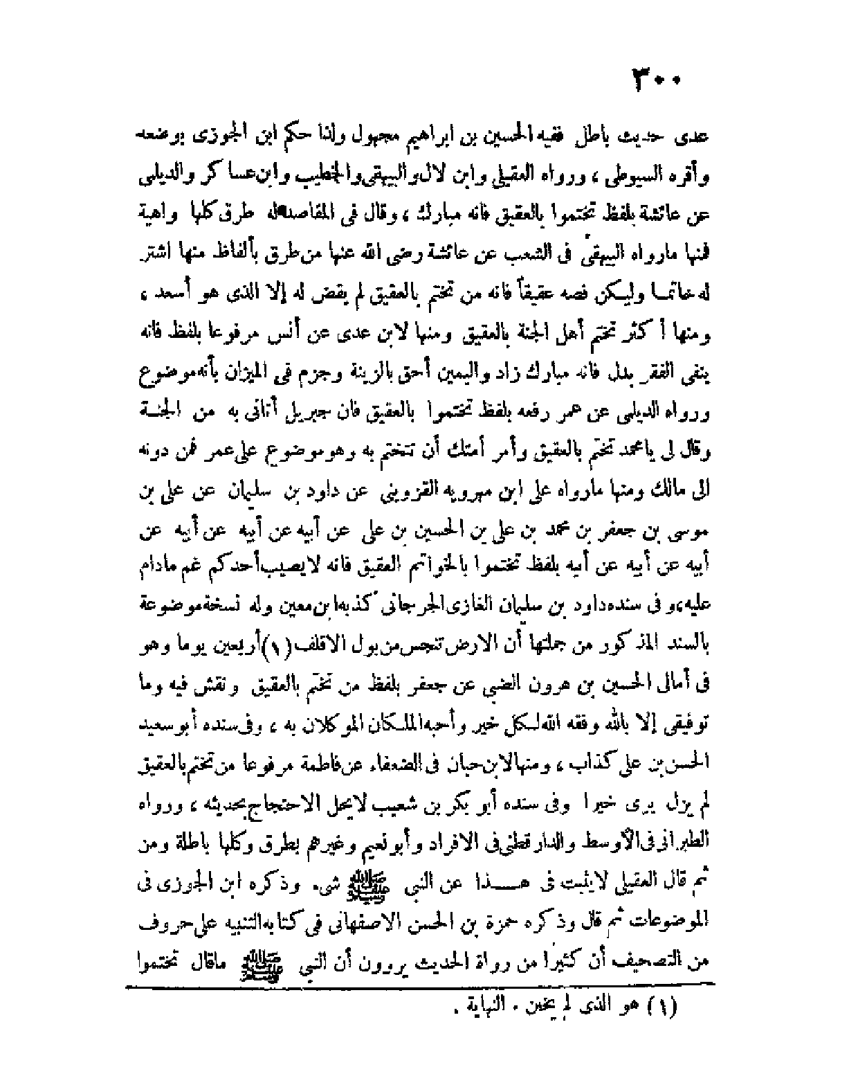 موسى بن جعفر بن محمد بن علي بن الحسين بن علي عن أبيه عن أبيه عن أبيه عن أبيه عن أبيه عن أبيه بلفظ تختموا بالخواتم العقيق فإنه لا يُصيب أحدَكم غم ما دام عليه، وفي سنده داود بن سليمان الغازي الجرجاني كذَّبه ابن مَعين وله نسخة موضوعة بالسند المذكور وفي جملتها أن الأرض تنجس من بول الأقلف (¬1) أربعين يوما وهو في أمالي الحسين بن هارون الضبي عن جعفر بلفظ من تختم بالعقيق ونقش فيه وما توفيقي إلا بالله وفقه الله لكل خير وأحبه الملَكان الموكَّلان به، وفي سنده أبو سعيد الحسن بن علي كذاب، ومنها لابن حبان في الضعفاء عن فاطمة مرفوعا من تختم بالعقيق لم يزل يرى خيرا، وفي سنده أبو بكر بن شعيب لا يحل الاحتجاج بحديثه، ورواه الطبراني في الأوسط والدارقطني في الأفراد، وأبو نعيم وغيره بطرق وكلُها باطلة، ومن ثم قال العقيلي لا يثبت في هذا عن النبي صلى الله عليه وسلم شئ وذكره ابن الجوزي في الموضوعات ثم قال وذكره حمزة بن الحسن الأصفهاني في كتابه التنبيه على حروف من التصحيف أن كثيرا من رواة الحديث يروون أن النبي صلى الله عليه وسلم ما قال تختموا