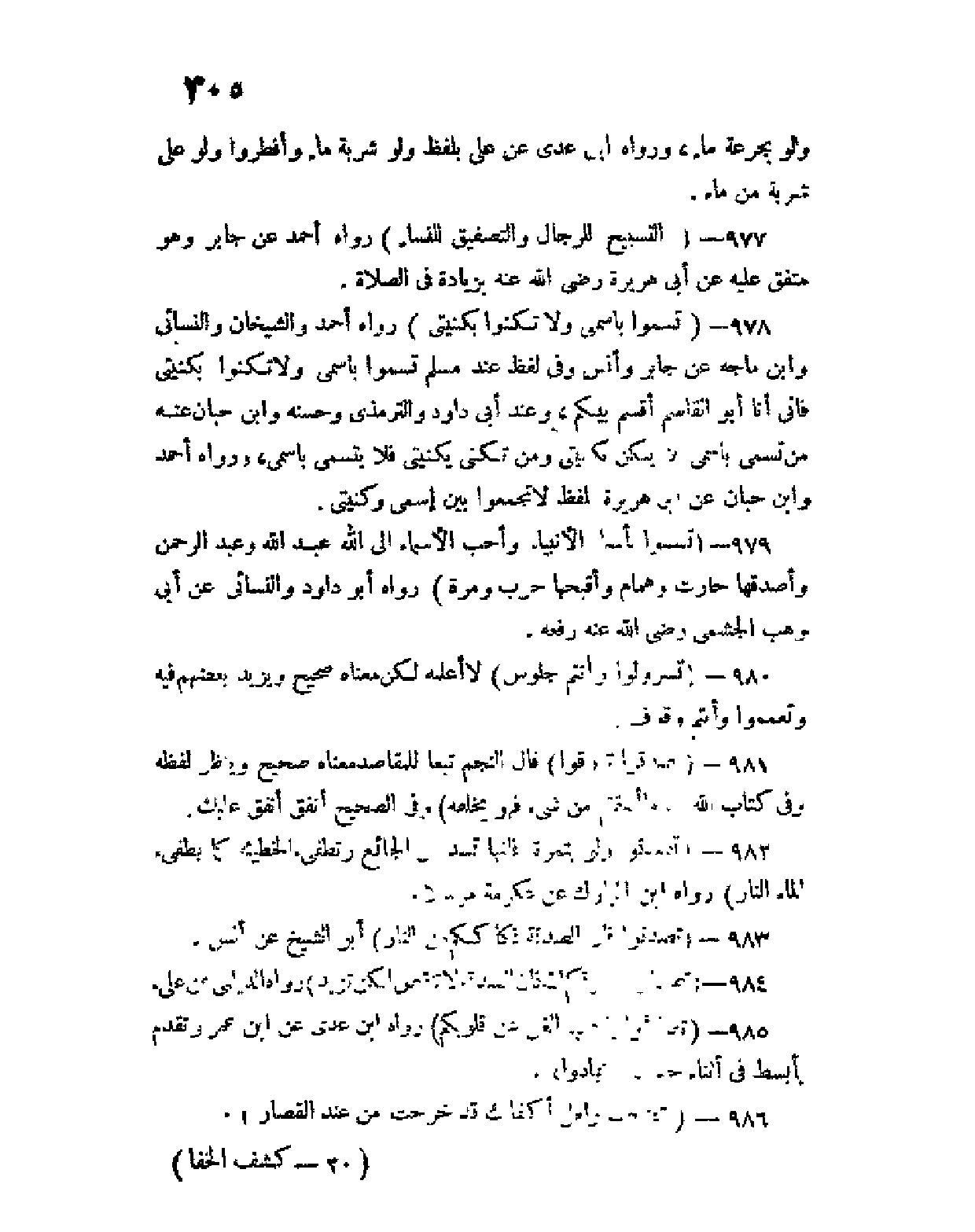 978 - (تَسَمَّوا باسمي، ولا تكنوا بكُنْيتي) رواه أحمد والشيخان والنسائي وابن ماجه عن جابر وأنس، وفي لفظ عند مسلم تسموا باسمي ولا تكنوا بكنيتي فإني أنا أبو القاسم، أقسم بينكم، وعند أبي داود والترمذي وحسنه وابن حبان عنه من تسمى باسمي فلا يتكن بكنيتي، ومن تكنى بكنيتي فلا يتسمى باسمي، ورواه أحمد وابن حبان عن أبي هريرة بلفظ لا تجمعوا بين اسمي وكنيتي.