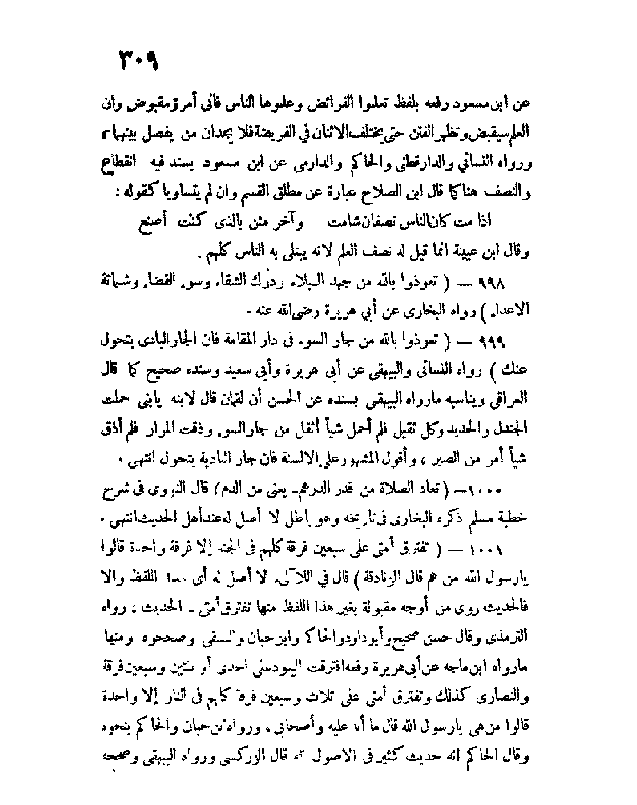999 - (تعوذوا بالله من جار السَوْء في دار المُقامة فإن الجار البادِيَ يَتحول عنك) رواه النسائي والبيهقي عن أبي هريرة وأبي سعيد، وسنده صحيح كما قال العراقي، ويناسبه ما رواه البيهقي بسنده عن الحسن أن لقمان قال لابنه يا بني حَمَلْتُ
