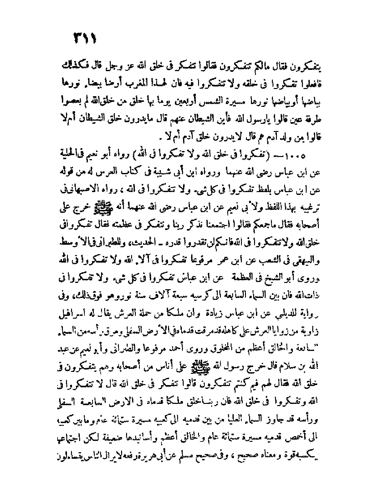 1005 - (تَفَكّروا في خلق الله، ولا تفكروا في الله) رواه أبو نعيم في الحلية عن ابن عباس رضي الله عنهما ورواه ابن أبي شيبة في كتاب العُرْس له من قوله عن ابن عباس بلفظ تفكروا في كل شئ ولا تتفكروا في الله، رواه الأصبهاني في ترغيبه بهذا اللفظ، ولأبي نعيم عن ابن عباس رضي الله عنهما أنه صلى الله عليه وسلم خرج على أصحابه فقال ما جَمَعَكم؟ فقالوا اجتمعنا نذكر ربنا ونتفكر في عظمته، فقال تفكروا في خلق الله ولا تتفكروا في الله فإنكم لن تَقْدُروا قدْرَه - الحديث، وللطبراني قي الأوسط والبيهقي في الشعب عن ابن عمر مرفوعا تفكروا في آلاء الله ولا تفكروا في الله وروى أبو الشيخ في العظَمة عن ابن عباس تفكروا في كل شئ ولا تفكروا في ذات الله، فإن بين السماء السابعة إلى كرسيه سبعة آلاف سنة نور، وهو فوق ذلك، وفي رواية للديلمي عن ابن عباس زيادة وإن ملكا من حَمَلَة العرش يقال له إسرافيل زاوية من زوايا العرش على كاهله قد مرقت قدماه في الأرض السفلى ومرق رأسه من السماء السابعة، والخالق أعظم من المخلوق، وروى أحمد مرفوعا والطبراني وأبو نعيم عن عبد الله بن سَلام قال خرج رسول الله صلى الله عليه وسلم على أناس من أصحابه وهم يتفكرون في خلق الله فقال لهم فيما كنتم تتفكرون؟ قالوا نتفكر في خلق الله، فقال لا تتفكروا في الله، وتفكروا في خلق الله، فإن ربنا خلق ملكا قدماه في الأرض السابعة السفلى ورأسه قد جاور السماء العليا، من بين قدميه إلى كعبيه مسيرة ستمائة عام، وما بين كعبيه إلى أخمص قدميه مسيرة ستمائة عام، والخالق أعظم، وأسانيدها ضعيفة، ولكن اجتماعها يكسبه قوة ومعناه صحيح، وفي صحيح مسلم عن أبي هريرة رفعه لا يزال الناس يتساءلون