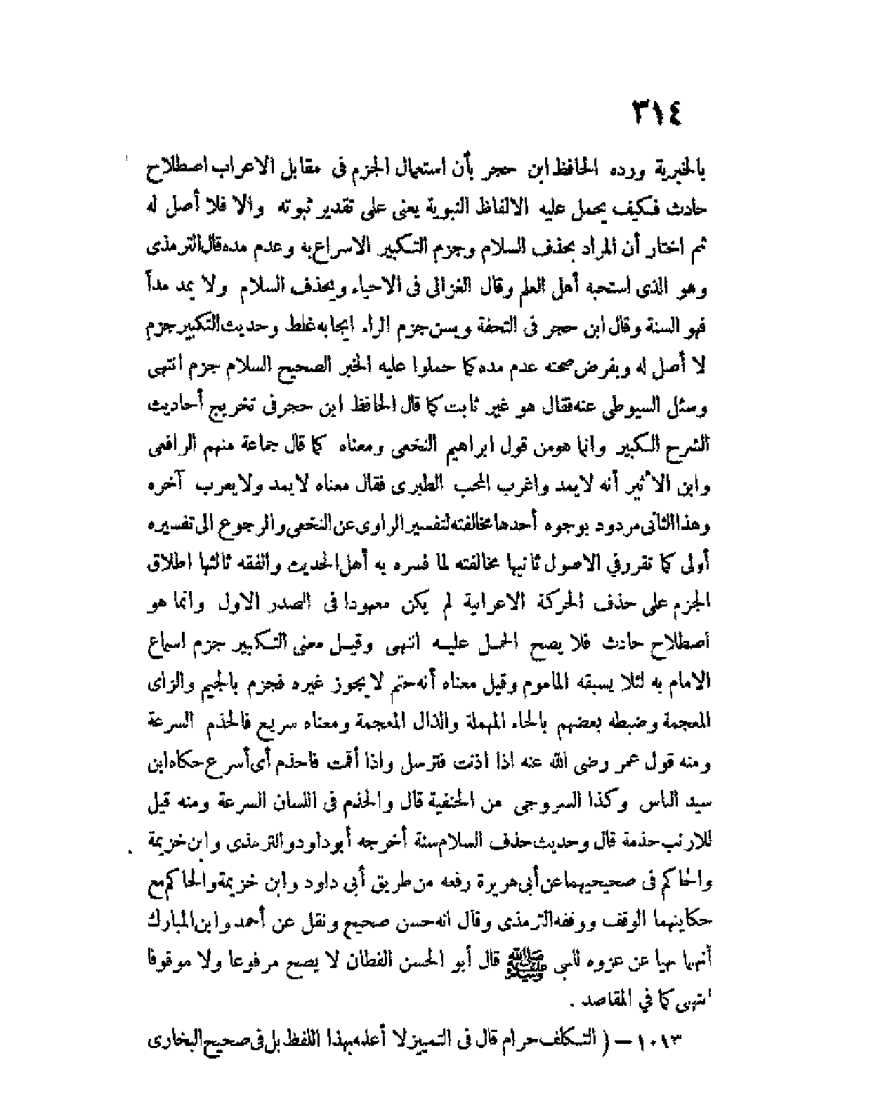 بالخبرية ورَدّهُ الحافظ ابن حجر بأن استعمال الجزم في مقابل الإعراب اصطلاح حادث، فكيف يحمل عليه الألفاظ النبوية، يعني على تقدير ثبوته وإلا فلا أصل له ثم اختار أن المراد ب " حذف السلام وجزم التكبير " الإسراع به وعدم مدِّه.