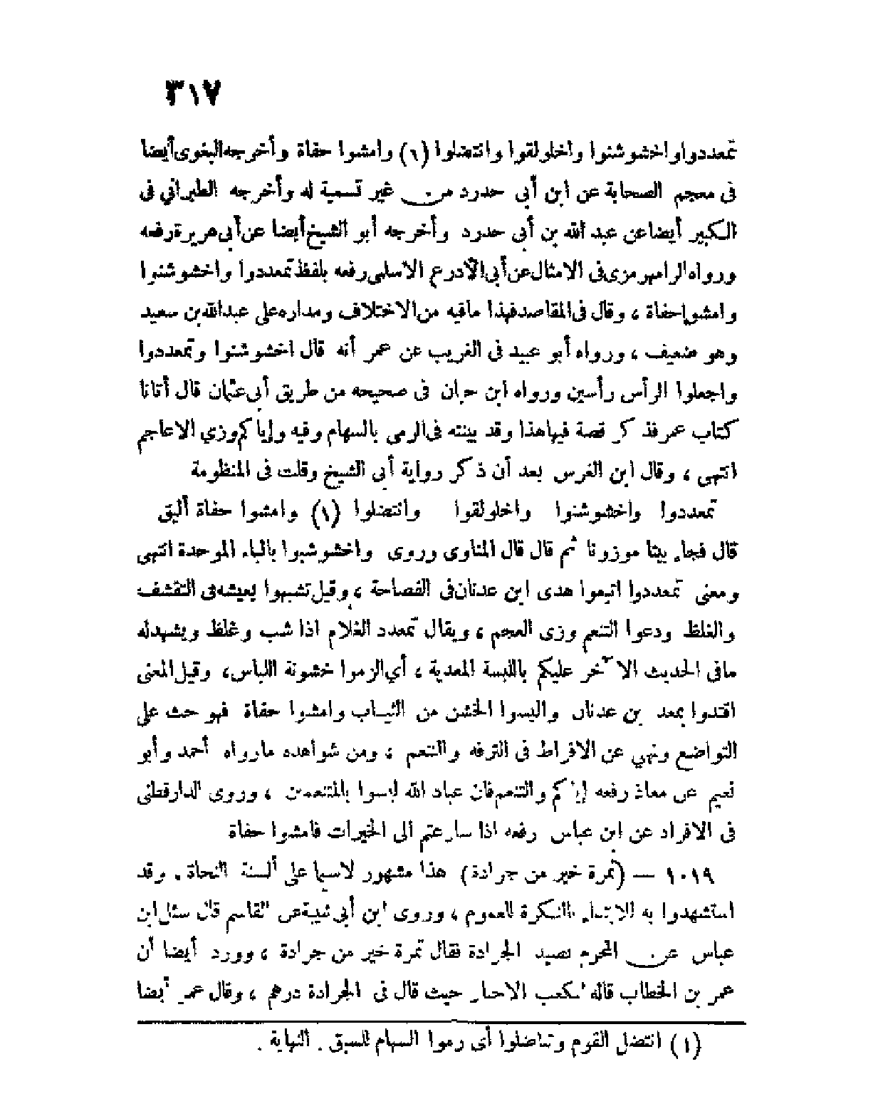 تمعددوا واخشوشنوا واخلولقوا وانتضلوا (¬1) وامشوا حفاة وأخرجه البغوي أيضا في معجم الصحابة عن ابن أبي حدرد من غير تسمية له، وأخرجه الطبراني في الكبير أيضا عن عبد الله بن أبي حدرد وأخرجه أبو الشيخ أيضا عن أبي هريرة رفعه ورواه الرامهرمزي في الأمثال عن أبي الأدرع الأسلمي رفعه بلفظ: تمعددوا واخشوشنوا وامشوا حفاة، قال في المقاصد: فهذا ما فيه من الاختلاف، ومداره على عبد الله بن سعيد وهو ضعيف، ورواه أبو عبيد في الغريب عن عمر أنه قال " اخشَوْشِنُوا وتَمَعْدَدُوا واجعلوا الرأس رأسين "، ورواه ابن حبان في صحيحه من طريق أبي عثمان قال: أتانا كتاب عمر فذكر قصة فيها هذا، وقد بينته في الرمي بالسهام، وفيه: وإياكم وزِيَّ الأعاجم انتهى، وقال ابن الغرس بعد أن ذكر رواية أبي الشيخ وقلت في المنظومة: تمعددوا واخشوشنوا واخلولقوا ... وانتضلوا (1) وامشوا حفاة أليَقُ قال فجاء بيتا موزونا، ثم قال قال المناوي: وروي " واخشوشبوا " بالباء الموحدة انتهى ومعنى تمعددوا اتبعوا هَدْيَ ابن عدنان في الفصاحة، وقيل تشبهوا بعيشه بالتقشف والغلظ ودعوا التنعيم وزي العجم، ويقال تمعدد الغلام إذا شب وغلظ ويشهد له ما في الحديث الآخر: عليكم باللبسة المعدّيَّةِ.