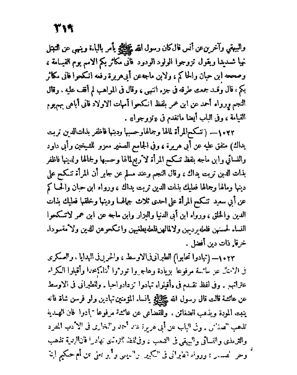 والبيهقي وآخرين عن أنس قال كان رسول الله صلى الله عليه وسلم يأمر بالباءة وينهي عن التبتل نهيا شديدا، ويقول تزوجوا الولود الودود فإني مكاثر بكم الأمم يوم القيامة، وصححه ابن حبان والحاكم، ولابن ماجه عن أبي هريرة رفعه: اِنكحوا فإني مكاثر بكم، قال وقد جمعت طرقه في جزء انتهى، وقال في المواهب لم أقف عليه، وقال النجم ورواه أحمد عن ابن عمر بلفظ: اِنكحوا أمهات الأولاد فإني أباهي بهم يوم القيامة، وفي الباب أيضا ما تقدم في " تزوجوا ".