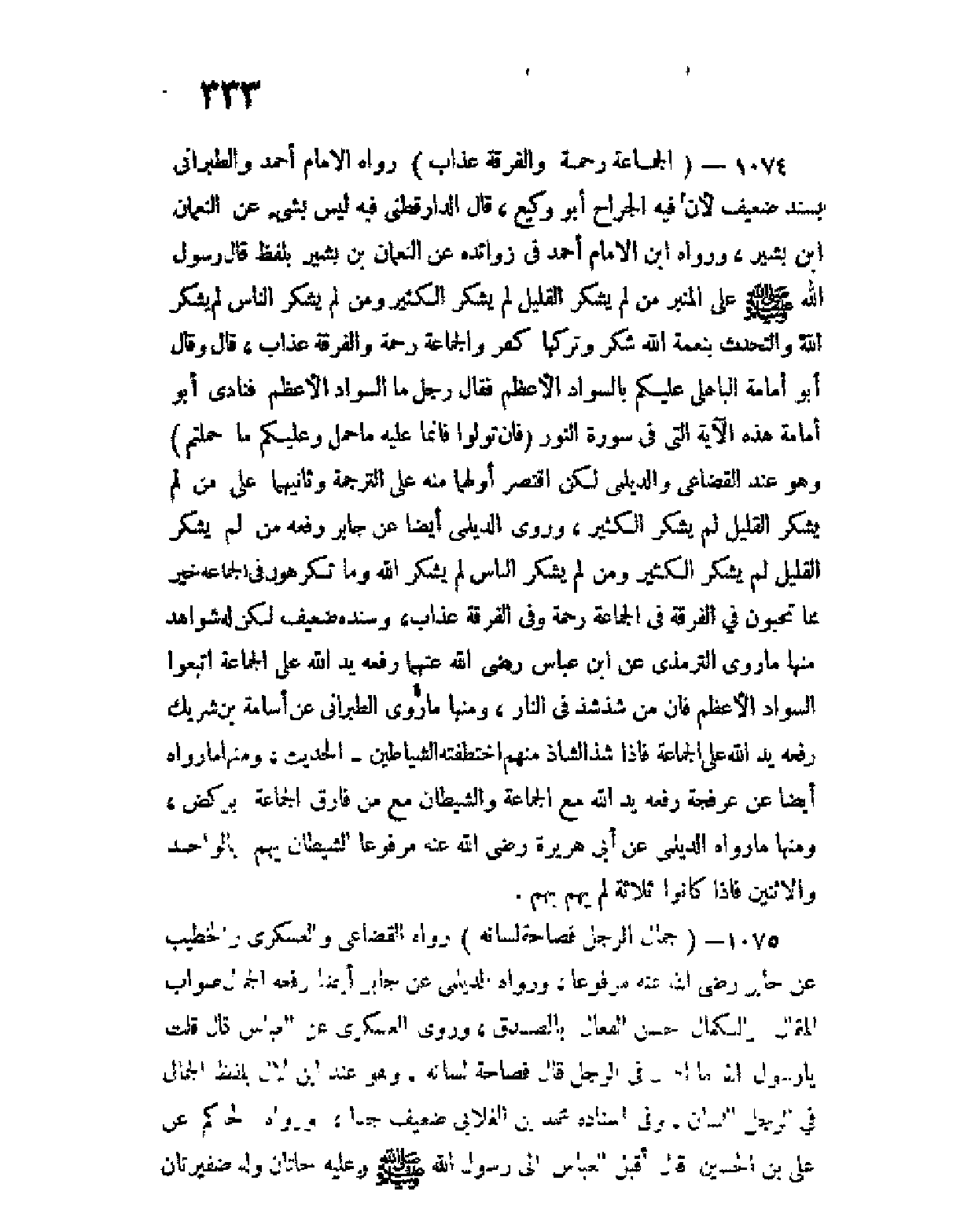 1074 - (الجماعة رحمة، والفرقة عذاب) رواه الإمام أحمد والطبراني بسند ضعيف لأن فيه الجراح أبو وكيع، قال الدارقطني فيه ليس بشئ عن النعمان ابن بشير، ورواه ابن الإمام أحمد في زوائده عن النعمان بن بشير بلفظ قال رسول الله صلى الله عليه وسلم على المنبر من لم يشكر القليل لم يشكر الكثير، ومن لم يشكر الناس لم يشكر الله، والتحدث بنعمة الله شكر، وتركها كفر، والجماعة رحمة والفرقة عذاب، قال وقال أبو إمامة الباهلي عليكم بالسواد الأعظم، فقال رجل ما السواد الأعظم؟ فنادى أبو إمامة هذه الآية من سورة النور ... (فإن تولوا فإنما عليه ما حمل وعليكم ما حملتم) ... وهو عند القضاعي والديلمي، لكن اقتصر أولهما منه على الترجمة، وثانيهما على من لم بشكر القليل لم يشكر الكثير، وروى الديلمي أيضا عن جابر رفعه من لم يشكر القليل لم يشكر الكثير، ومن لم يشكر الناس لم يشكر الله، وما تكرهون في الجماعة خير مما تحبون في الفرقة، في الجماعة رحمة، وفي الفرقة عذاب، وسنده ضعيف لكن له شواهد منها ما روى الترمذي عن ابن عباس رضي الله عنهما رفعه يد الله على الجماعة، اتبعوا السواد الأعظم، فإن من شذ شذ في النار، ومنها ما روى الطبراني عن أسامة بن شريك رفعه يد الله على الجماعة، فإذا شذ الشاذ منهم اختطفته الشياطين - الحديث، ومنها ما رواه أيضا عن عرفجة رفعه يد الله مع الجماعة، والشيطان مع من فارق الجماعة يركض، ومنها ما رواه الديلمي عن أبي هريرة رضي الله عنه مرفوعا الشيطان يهم بالواحد والاثنين، فإذا كانوا ثلاثة لم يهم بهم.