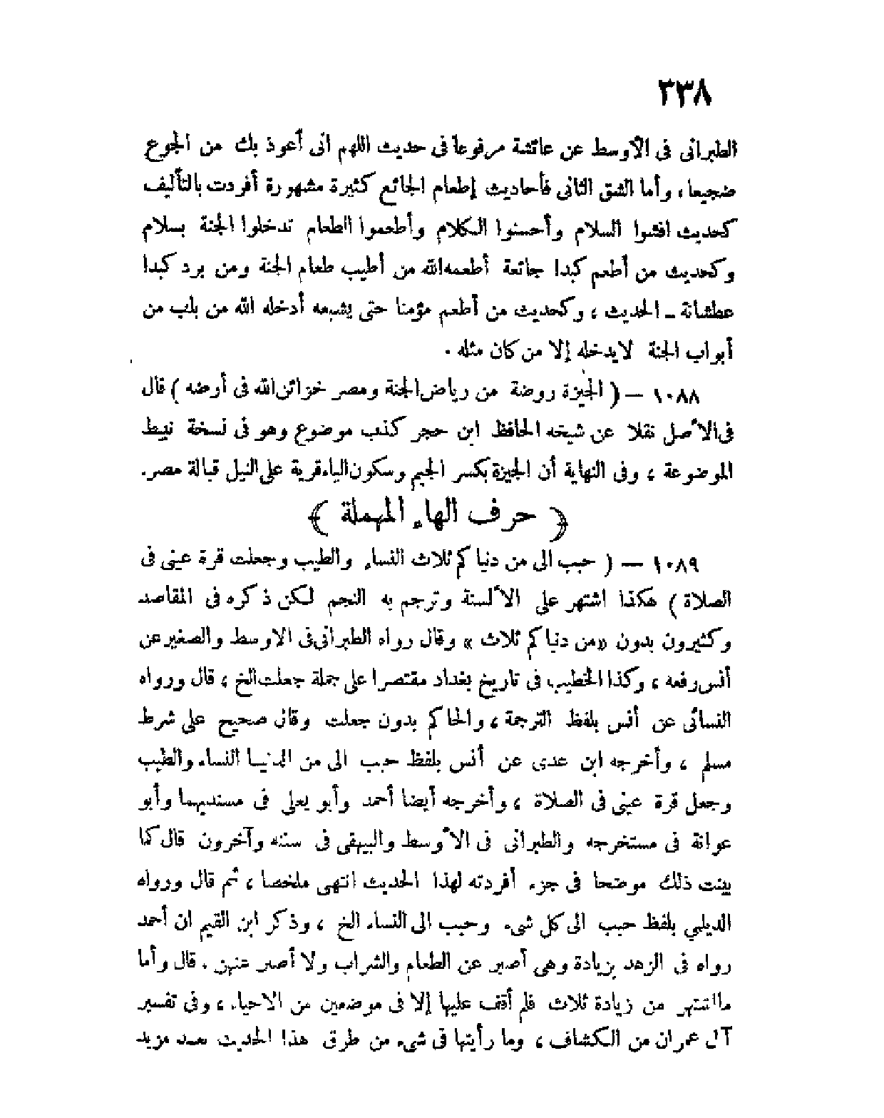1089 - (حبب إلي من دنياكم ثلاث: النساء، والطيب، وجعلت قرة عيني في الصلاة) هكذا اشتهر على الألسنة، وترجم به النجم، لكن ذكره في المقاصد وكثيرون بدون " من دنياكم ثلاث " وقال رواه الطبراني في الأوسط والصغير عن أنس رفعه، وكذا الخطيب في تاريخ بغداد مقتصرا على جملة جعلت إلخ، قال ورواه النسائي عن أنس بلفظ الترجمة، والحاكم بدون جعلت وقال صحيح على شرط مسلم، وأخرجه ابن عدي عن أنس بلفظ حبب إلي من الدنيا: النساء، والطيب وجعل قرة عيني في الصلاة، وأخرجه أيضا وأبو يعلى في مسنديهما وأبو