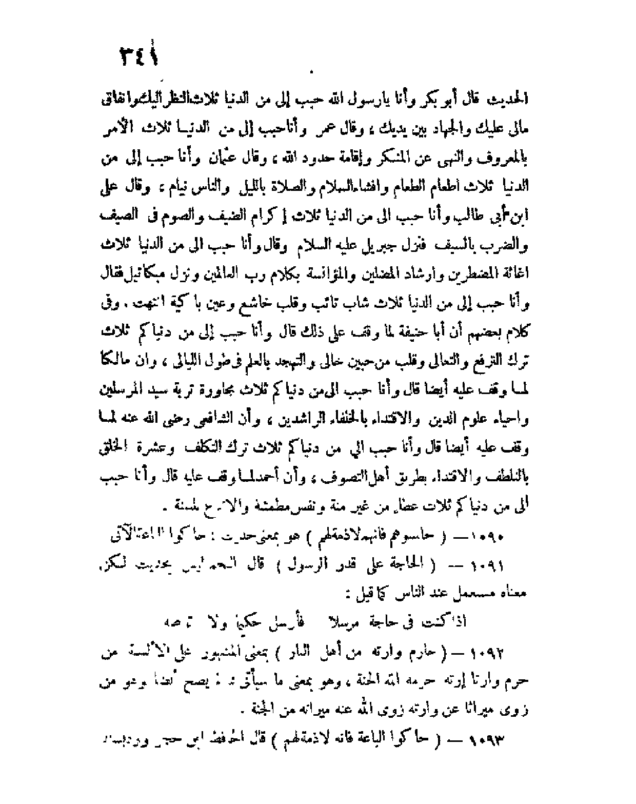 وقال علي ابن أبي طالب: وأنا حبب إلي من الدنيا ثلاث: إكرام الضيف والصوم في الصيف والضرب بالسيف، فنزل جبريلَ عليه السلام وقال: وأنا حبب إلي من الدنيا ثلاث إغاثة المضطرين، وإرشاد المضلين، والمؤانسة بكلام رب العالمين ونزل ميكائيل فقال وأنا حبب إلي من الدنيا ثلاث: شاب تائب، وقلب خاشع، وعين باكية انتهت، وفي كلام بعضهم أن أبا حنيفة لما وقف على ذلك قال: وأنا حبب إلي من دنياكم ثلاث ترك الترفع والتعالي، وقلب من حبين خالي، والتهجد بالعلم في طول الليالي وأن مالكا لما وقف عليه أيضا قال: وأنا حبب إلي من دنياكم ثلاث: مجاورة تربة سيد المرسلين،وإحياء علوم الدين، والاقتداء بالخلفاء الراشدين.