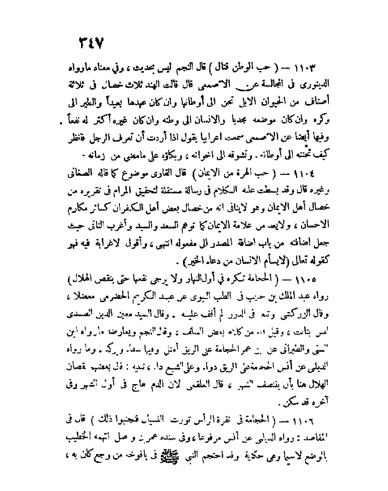 1104 - (حب الهرة من الإيمان) قال القاري موضوع كما قاله الصغاني وغيره، قال وقد بسطت عليه الكلام في رسالة مستقلة لتحقيق المرام في تقريره من خصال أهل الإيمان وهو لا ينافي أنه من خصال بعض أهل الكفران كسائر مكارم الإحسان، ولا يعد من علامة الإيمان كما توهم السعد والسيد وأغرب الثاني حيث جعل إضافته من باب إضافة المصدر إلى مفعوله انتهى، وأقول لا غرابة فيه فهو كقوله تعالى ... (لا يسأم الإنسان من دعاء الخير) ... .