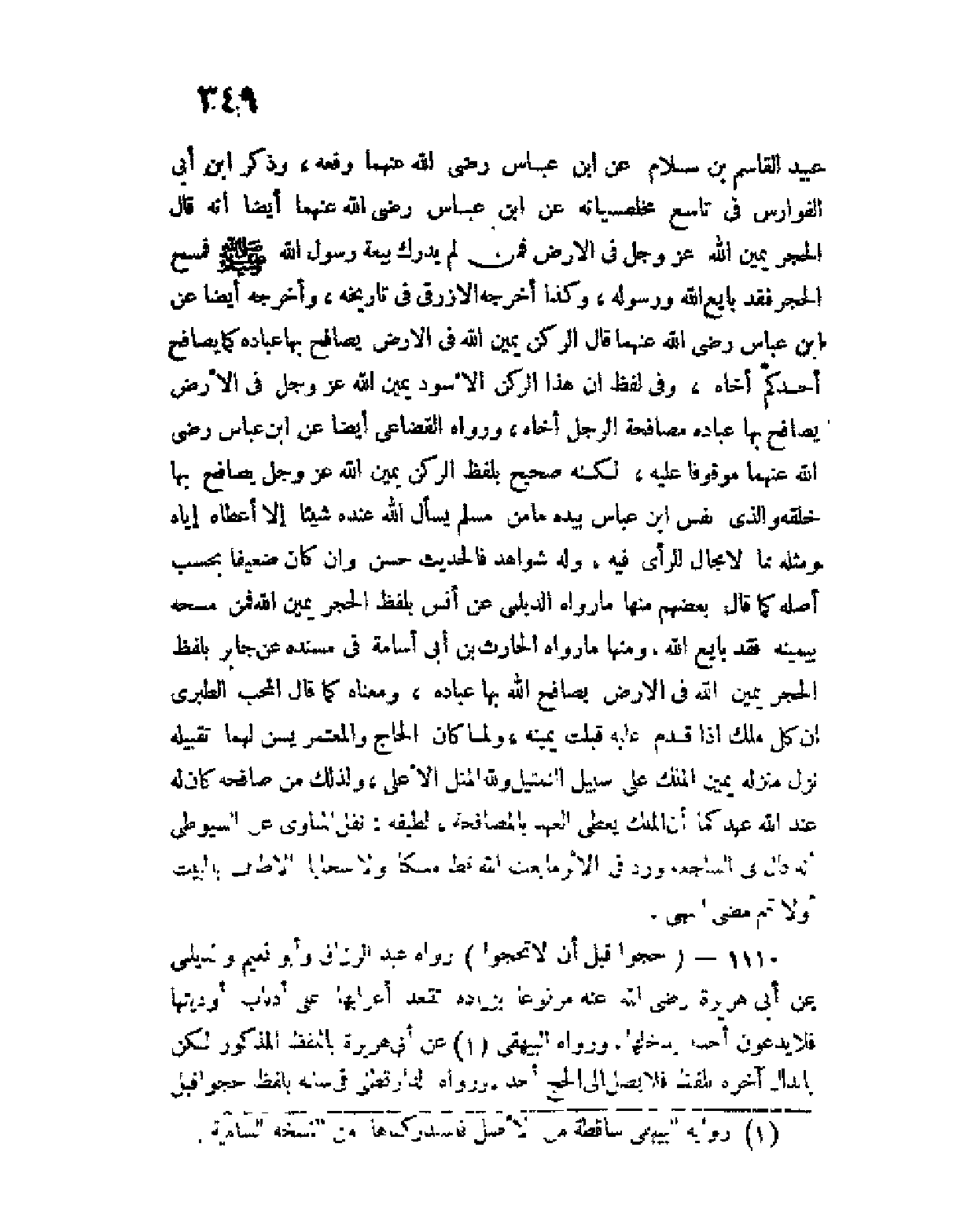 عبيد القاسم بن سلام عن ابن عباس رضي الله عنهما رفعه، وذكر ابن أبي الفوارس في تاسع مخلصياته عن ابن عباس رضي الله عنهما أيضا أنه قال الحجر يمين الله عز وجل في الأرض فمن لم يدرك بيعة رسول الله صلى الله عليه وسلم فمسح الحجر فقد بايع الله ورسوله، وكذا أخرجه الأزرقي في تاريخه، وأخرجه أيضا عن ابن عباس رضي الله عنهما قال الركن يمين الله في الأرض يصافح بها عباده كما يصافح أحدكم أخاه، وفي لفظ إن هذا الركن الأسود يمين الله عز وجل في الأرض يصافح بها عباده مصافحة الرجل أخاه، ورواه القضاعي أيضا عن ابن عباس رضي الله عنهما موقوفا عليه، لكنه صحيح بلفظ الركن يمين الله عز وجل يصافح بها خلقه والذي نفس ابن عباس بيده ما من مسلم يسأل الله عنده شيئا إلا أعطاه إياه ومثله مما لا مجال للرأي فيه، وله شواهد فالحديث حسن وإن كان ضعيفا بحسب أصله كما قال بعضهم منها ما رواه الديلمي عن أنس بلفظ الحجر يمين الله فمن مسحه بيمينه فقد بايع الله، ومنها ما رواه الحارث بن أبي أسامة في مسنده عن جابر بلفظ الحجر يمين الله في الأرض يصافح بها عباده، ومعناه كما قال المحب الطبري أن كل ملك إذا قدم عليه قبلت يمينه، ولما كان الحاج والمعتمر يسن لهما تقبيله نزل منزلة يمين الملك على سبيل التمثيل ولله المثل الأعلى، ولذلك من صافحه كان له عند الله عهد كما أن الملك يعطي العهد بالمصافحة، لطيفة: نقل المناوي عن السيوطي
