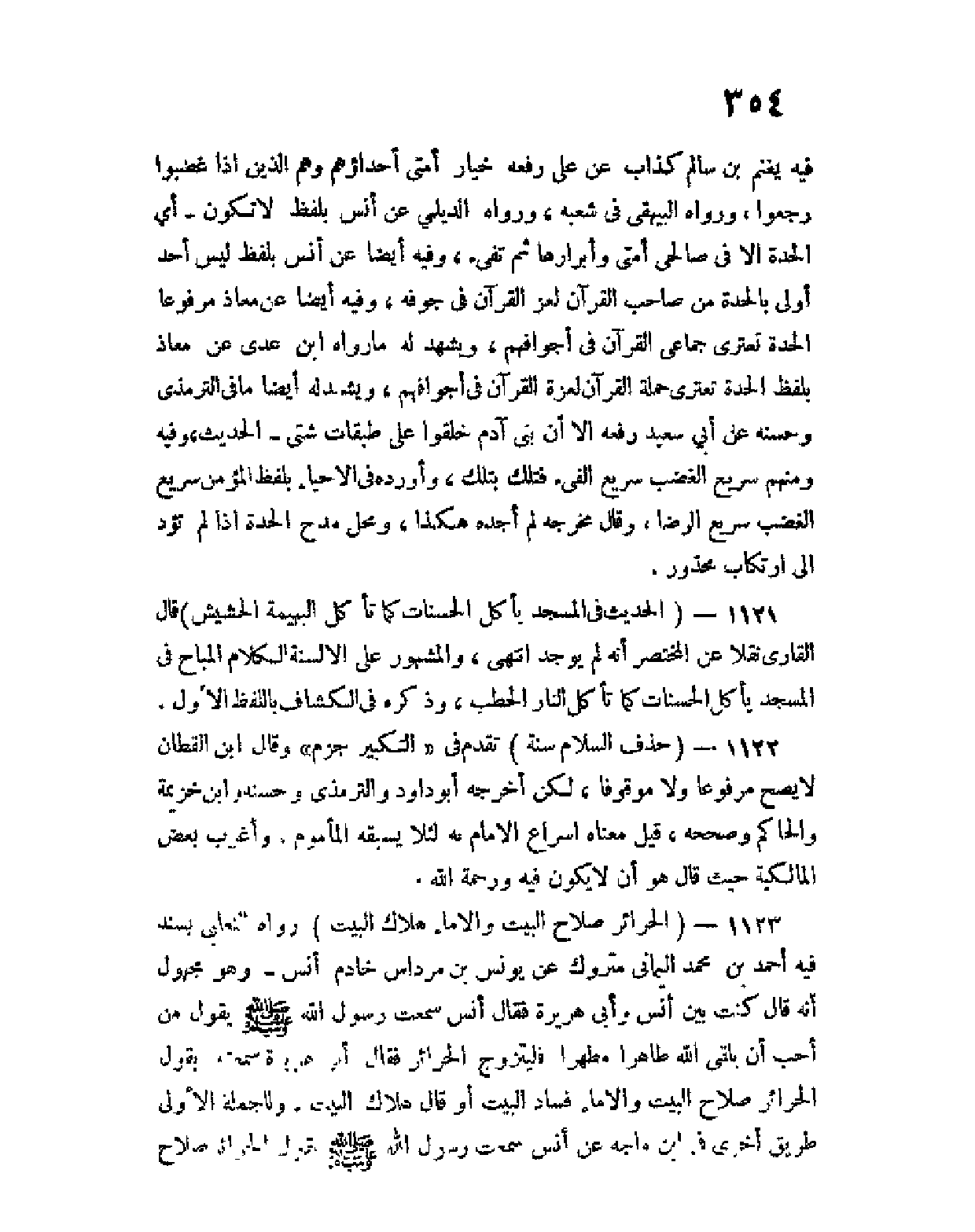 1123 - (الحرائر صلاح البيت، والإماء هلاك البيت) رواه الثعلبي بسند فيه أحمد بن محمد اليماني متروك عن يونس بن مرداس خادم أنس وهو مجهول أنه قال كنت بين أنس وأبي هريرة، فقال أنس سمعت رسول الله صلى الله عليه وسلم يقول من أحب أن يلقى الله طاهرا مطهرا فليتزوج الحرائر، فقال أبو هريرة سمعته يقول الحرائر صالح البيت، والإماء فساد البيت، أو قال هلاك البيت، وللجملة الأولى طريق أخرى في ابن ماجه عن أنس سمعت رسول الله صلى الله عليه وسلم يقول الحرائر صلاح