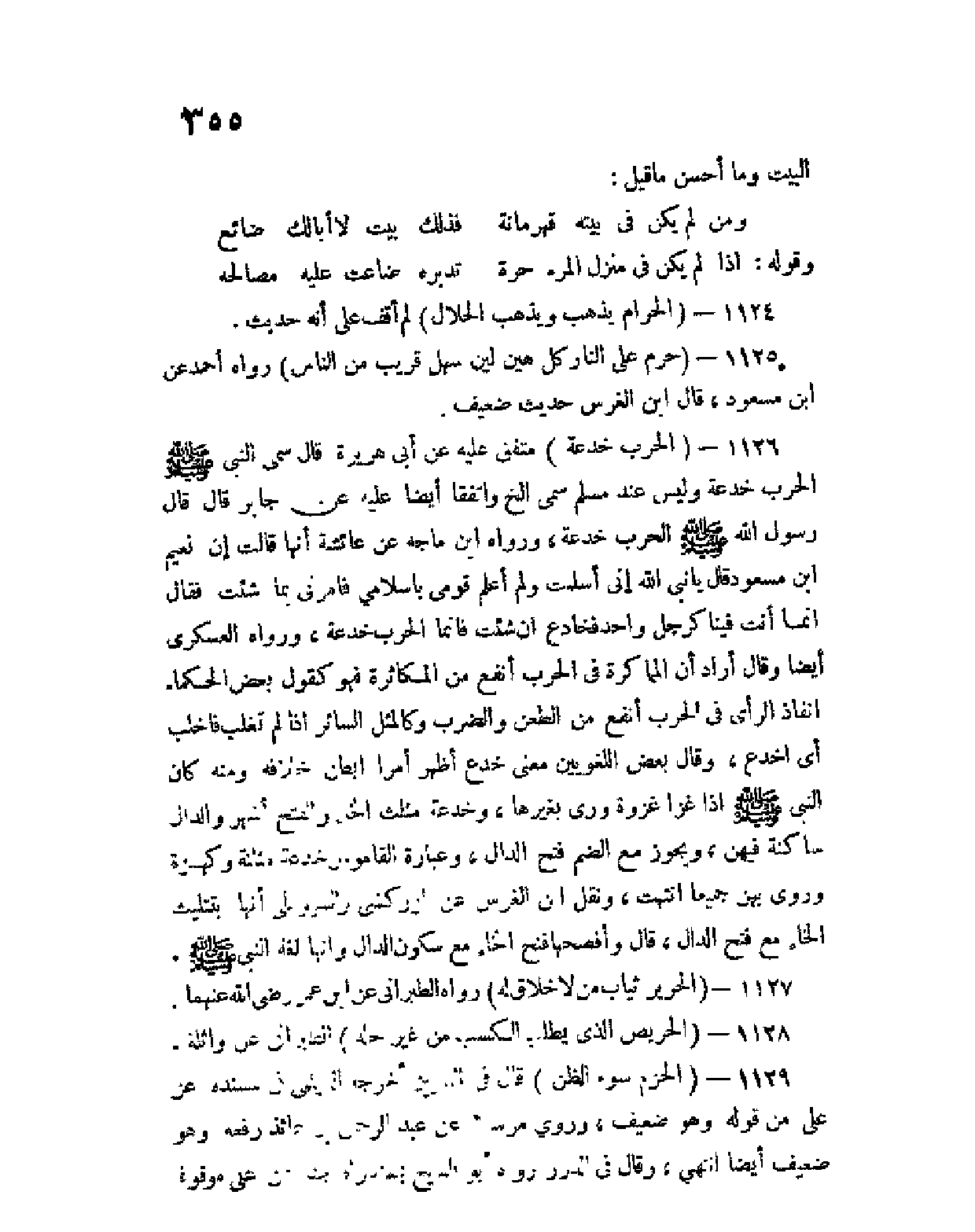 1126 - (الحرب خدعة) متفق عليه عن أبي هريرة قال سمى النبي صلى الله عليه وسلم الحرب خدعة، وليس عند مسلم سمى إلخ، واتفقا أيضا عليه عن جابر قال قال رسول الله صلى الله عليه وسلم الحرب خدعة، ورواه ابن ماجه عن عائشة أنها قالت إن نعيم ابن مسعود قال يا نبي الله إني أسلمت ولم أعلم قومي بإسلامي فأمرني بما شئت، فقال إنما أنت فينا كرجل واحد، فخادع إن شئت، فإنما الحرب خدعة، ورواه العسكري أيضا، وقال أراد أن المُمَاكرة في الحرب أنفع من المكاثرة، فهو كقول بعض الحكماء إنفاذ الرأي في الحرب أنفع من الطعن والضرب، وكالمثل السائر إذا لم تغلب فأخلب أي اِخدع، وقال بعض اللغويين معنى خدع أظهر أمرا أبطن خلافه، ومنه كان النبي صلى الله عليه وسلم إذا غزا غزوة وَرّى بغيرها، وخدعة مثلث الخاء والفتح أشهر، والدال ساكنة فيهن، ويجوز مع الضم فتح الدال، وعبارة القاموس خدعة مثلثة وكهمزة وروي بهن جميعا انتهت، ونقل ابن الغرس عن الزركشي والسيوطي أنها بتثليث الخاء مع فتح الدال، قال وأفصحها فتح الخاء مع سكون الدال وأنها لغة النبي صلى الله عليه وسلم.