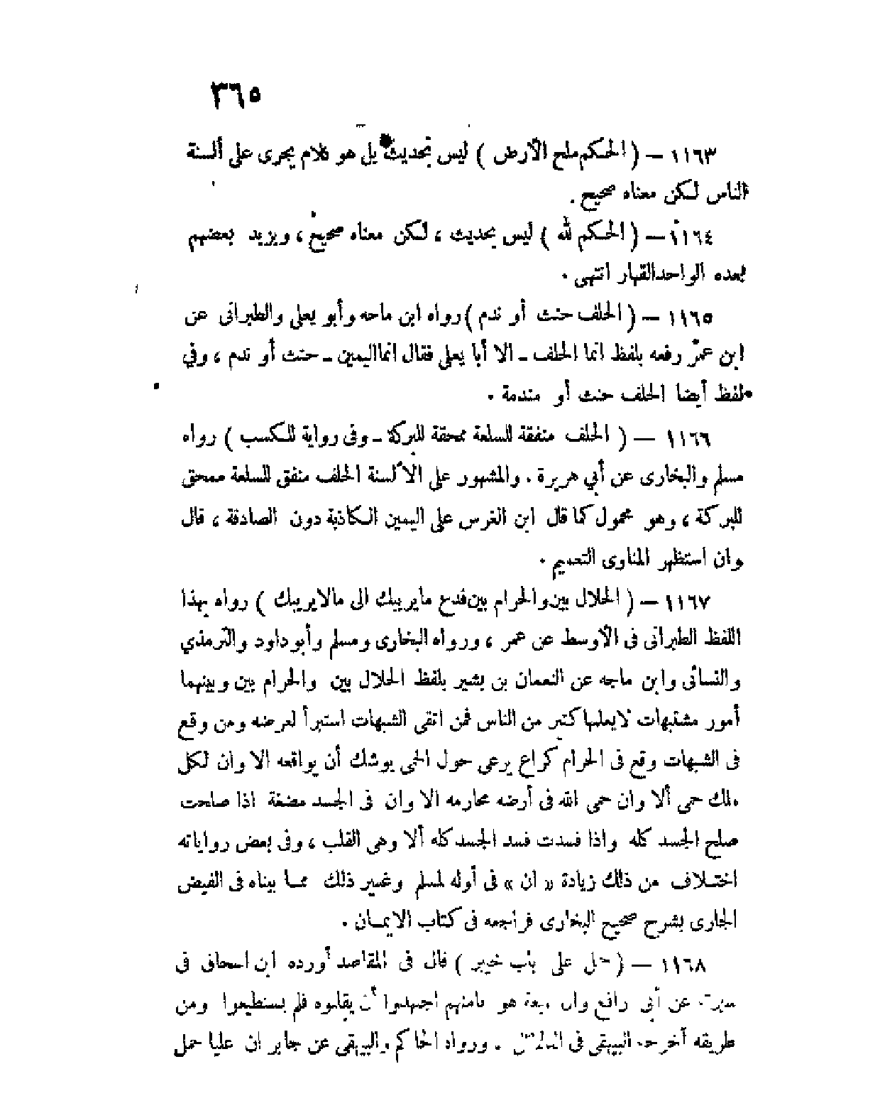 1167 - (الحلال بين، والحرام بين، فدع ما يريبك إلى ما لا يريبك) رواه بهذا اللفظ الطبراني في الأوسط عن عمر، ورواه البخاري ومسلم وأبو داود والترمذي والنسائي وابن ماجه عن النعمان بن بشير بلفظ الحلال بين، والحرام بين، وبينهما أمور مشتبهات، لا يعلمها كثير من الناس، فمن اتقى الشبهات استبرأ لعرضه، ومن وقع في الشبهات وقع في الحرام، كراع يرعى حول الحمى يوشك أن يواقعه، ألا وإن لكل ملك حمى، ألا وإن حمى الله في أرضه محارمه، ألا وأن في الجسد مضغة إذا صلحت صلح الجسد كله، وإذا فسدت فسد الجسد كله، ألا وهي القلب، وفي بعض رواياته اختلاف من ذلك زيادة " إن " في أوله لمسلم وغير ذلك مما بيناه في الفيض الجاري بشرح صحيح البخاري فراجعه في كتاب الإيمان.