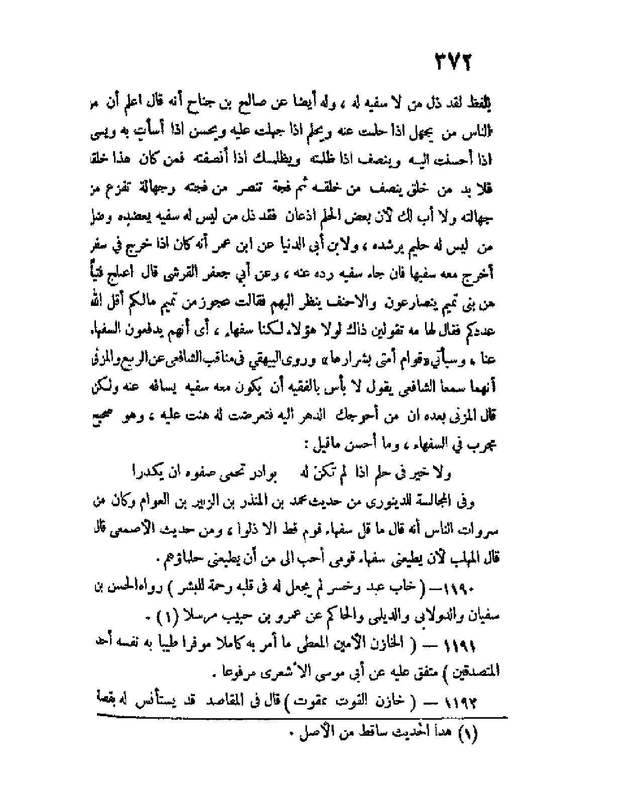وفي المجالسة للدينوري من حديث محمد بن المنذر بن الزبير بن العوام وكان من سروات الناس أنه قال ما قل سفهاء قوم قط إلا ذلوا، ومن حديث الأصمعي قال قال المهلب لأن يطيعني سفهاء قومي أحب إلي من أن يطيعني حلماؤهم.