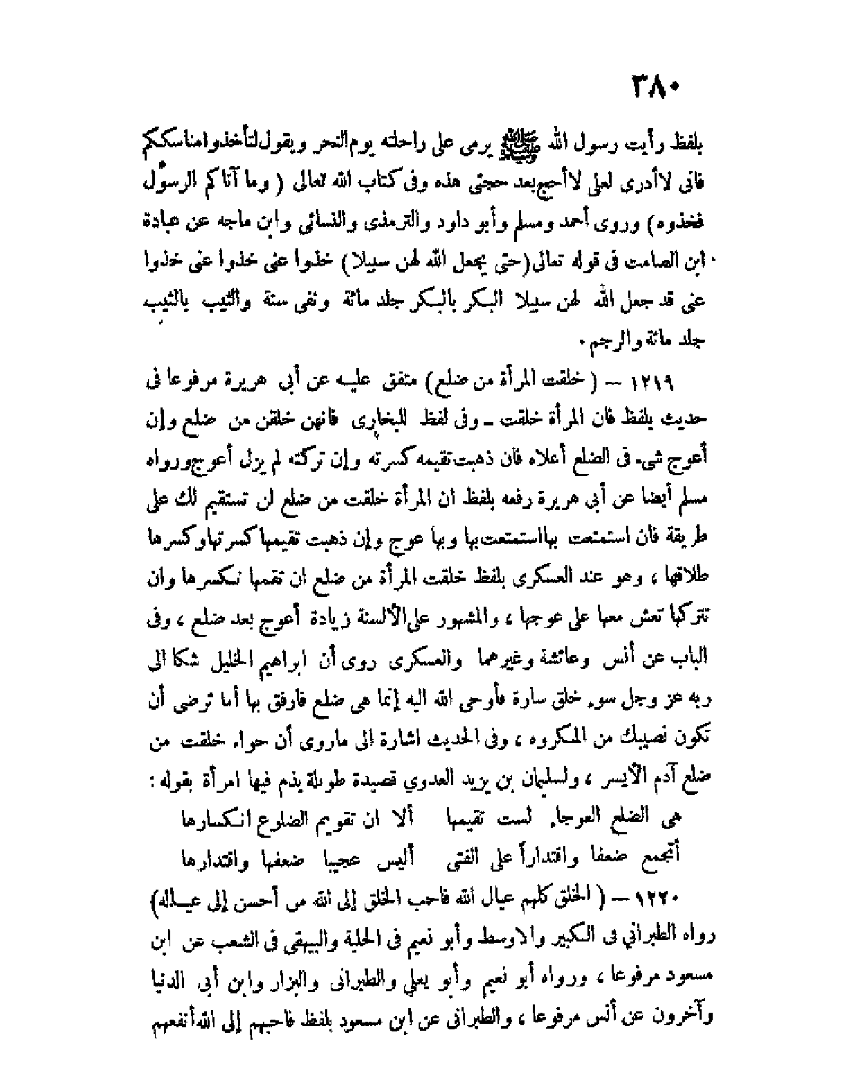 1219 - (خلقت المرأة من ضلع) متفق عليه عن أبي هريرة مرفوعا في حديث بلفظ فإن المرأة خُلقت - وفي لفظ للبخاري فإنهن خلقن من ضِلَع، وإن أعوج شئ في الضلع أعلاه، فإن ذهبْتَ تُقيمه كسرته، وإن تركته لم يزل أعوج، ورواه مسلم أيضا عن أبي هريرة رفعه بلفظ أن المرأة خلقت من ضلع، لن تستقيم لك على طريقة فإن استمتعت بها استمتعت بها وبها عِوَج، وإن ذهبت تقيمها كسرتها وكسرها طلاقها، وهو عند العسكري بلفظ خلقت المرأة من ضلع إن تقمها تكسرها، وإن تتركها تعش معها على عوجها، والمشهور على الألسنة زيادة أعوج بعد ضلع، وفي الباب عن أنس وعائشة وغيرهما والعسكري روى أن إبراهيم الخليل شكى إلى ربه عز وجل سوء خلق ساره، فأوحى الله إليه إنما هي ضلع فارفق بها، أما ترضى أن تكون نصيبك من المكروه، وفي الحديث إشارة إلى ما روي أن حواء خلقت من ضلع آدم الأيسر، ولسليمان بن يزيد العدوي قصيدة طويلة يذم فيها امرأة بقوله: هي الضلع العوجاء لست تقيمها ... ألا إن تقويم الضلوع انكسارها أتجمع ضعفا واقتدارا على الفتى ... أليس عجيبا ضعفها واقتدارها.
