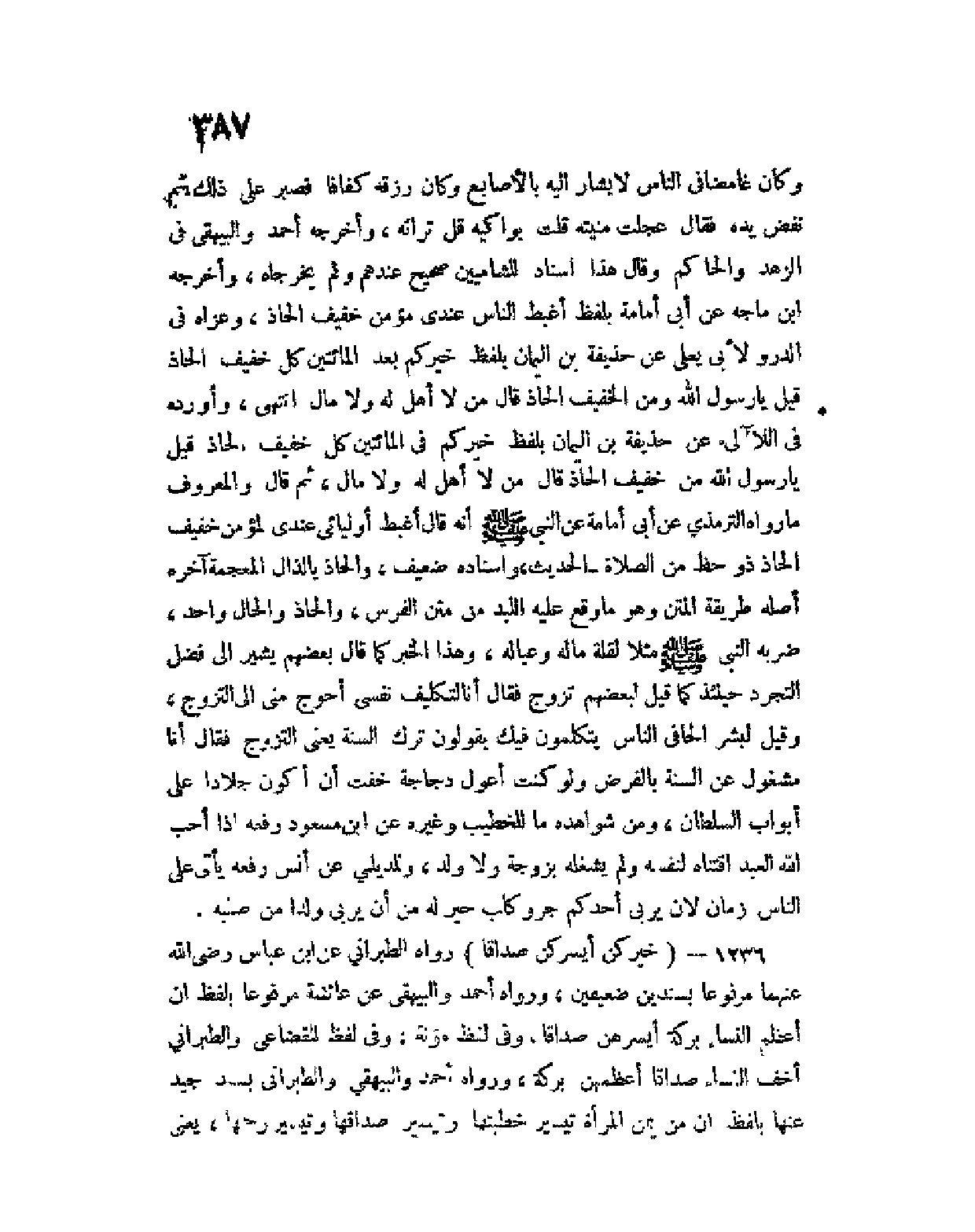 وكان غامضا في الناس، لا يشار إليه بالأصابع، وكان رزقه كفافا فصبر على ذلك، ثم نفض يده فقال عجلت منيته، قلت بواكيه، قل تراثه، وأخرجه أحمد والبيهقي في الزهد، والحاكم وقال هذا إسناد للشاميين صحيح عندهم، ولم يخرجاه، وأخرجه ابن ماجه عن أبي أمامة بلفظ أغبط الناس عندي مؤمن خفيف الحاذ، وعزاه في الدرر لأبي يعلى عن حذيفة بن اليمان بلفظ خيركم بعد المائتين كل خفيف الحاذ، قيل يا رسول الله ومن الخفيف الحاذ؟ قال ومن لا أهل له ولا مال انتهى، وأورده في اللآلئ عن حذيفة بن اليمان بلفظ خيركم في المائتين كل خفيف الحاذ، قيل يا رسول الله من الخفيف الحاذ؟ قال من لا أهل له ولا مال، ثم قال والمعروف ما رواه الترمذي عن أبي أمامة عن النبي صلى الله عليه وسلم أنه قال أغبط أوليائي عندي لمؤمن خفيف الحاذ ذو حظ من الصلاة - الحديث، وإسناده ضعيف، و " الحاذ " بالذال المعجمة آخره أصله طريقة المتن وهو ما وقع عليه اللبد من متن الفرس، و " الحاذ " والحال واحد، ضربه النبي صلى الله عليه وسلم مثلا لقلة ماله وعياله، وهذا الخبر كما قال بعضهم يشير إلى فضل التجرد حينئذ كما قيل لبعضهم تزوج، فقال أنا لتكليفي نفسي أحوج مني إلى التزوج، وقيل لبشر الحافي الناس يتكلمون فيك يقولون ترك السنة يعني التزوج، فقال أنا مشغول عن السنة بالفرض ولو كنت أعول دجاجة خفت أن أكون جلادا على أبواب السلطان، ومن شواهده ما للخطيب وغيره عن ابن مسعود رفعه إذا أحب الله العبد اقتناه لنفسه ولم يشغله بزوجة ولا ولد، وللديلمي عن أنس رفعه يأتي على الناس زمان لأن يربي أحدكم جرو كلب خير له من أن يربي ولد من صلبه.