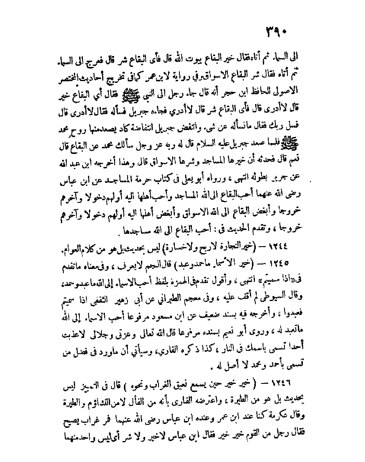 إلى السماء، ثم أتاه فقال خير البقاع بيوت الله، قال فأي البقاع شر؟ قال فعرج إلى السماء ثم أتاه فقال شر البقاع الأسواق، وفي رواية لابن عمر كما في تخريج أحاديث المختصر الأصولي للحافظ ابن حجر أنه قال جاء رجل إلى النبي صلى الله عليه وسلم فقال أي البقاع خير قال لا أدري، قال فأي البقاع شر؟ قال لا أدري، فجاءه جبريل فسأله، فقال لا أدري، قال فسل ربك، فقال ما نسأله عن شئ، وانتفض جبريل انتفاضة كاد يصعد منها روح محمد صلى الله عليه وسلم فلما صعد جبريلَ عليه السلام قال له ربه عز وجل سألك محمد عن البقاع؟ قال نعم، قال فحدثه أن خيرها المساجد وشرها الأسواق، قال وهذا أخرجه ابن عبد الله عن خرير بطول انتهى، ورواه أبو يعلى في كتاب حرمة المساجد عن ابن عباس رضي الله عنهما أحب البقاع إلى الله المساجد، وأحب أهلها إليه أولهم دخولا وآخرهم خروجا، وأبغض البقاع إلى الله الأسواق، وأبغض أهلها إليه أولهم دخولا وآخرهم خروجا، وتقدم الحديث في: أحب البقاع إلى الله مساجدها.