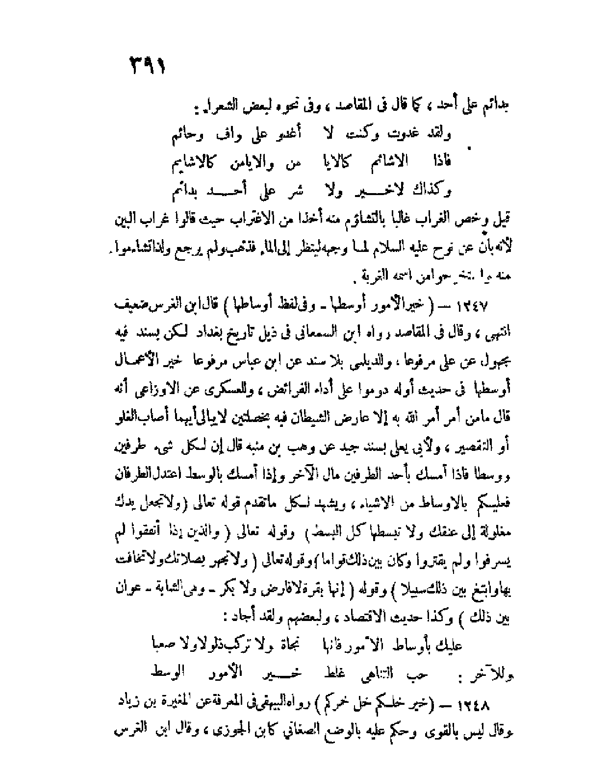 1247 - (خير الأمور أوسطها - وفي لفظ أوساطها) قال ابن الغرس ضعيف انتهى، وقال في المقاصد رواه ابن السمعاني في ذيل تاريخ بغداد لكن بسند فيه مجهول عن علي مرفوعا، وللديلمي بلا سند عن ابن عباس مرفوعا خير الأعمال أوسطها في حديث أوله دوموا على أداء الفرائض، وللعسكري عن الأوزاعي أنه قال ما من أمرٍ أمرَ الله به إلا عارض الشيطان فيه بخصلتين لا يبالي أيهما أصاب: الغلو أو التقصير، ولأبي يعلى بسند جيد عن وهب بن منبه قال إن لكل شئ طرفين ووسطا فإذا أمسك بأحد الطرفين مال الآخر وإذا أمسك بالوسط اعتدل الطرفان فعليكم بالأوساط من الأشياء، ويشهد لكل ما تقدم قوله تعالى ... (ولا تجعل يدك مغلولة غلى عنقك ولا تبسطها كل البسط) ... وقوله تعالى ... (والذين إذا أنفقوا لم يسرفوا ولم يقتروا وكان بين ذلك قواما) ... وقوله تعالى ... (ولا تجهر بصلاتك ولا تخافت بها وابتغ بين ذلك سبيلا) ... وقوله ... (إنها بقرة لا فارض ولا بكر - وهي الشابة - عوان بين ذلك) ... وكذا حديث الاقتصاد، ولبعضهم ولقد أجاد: