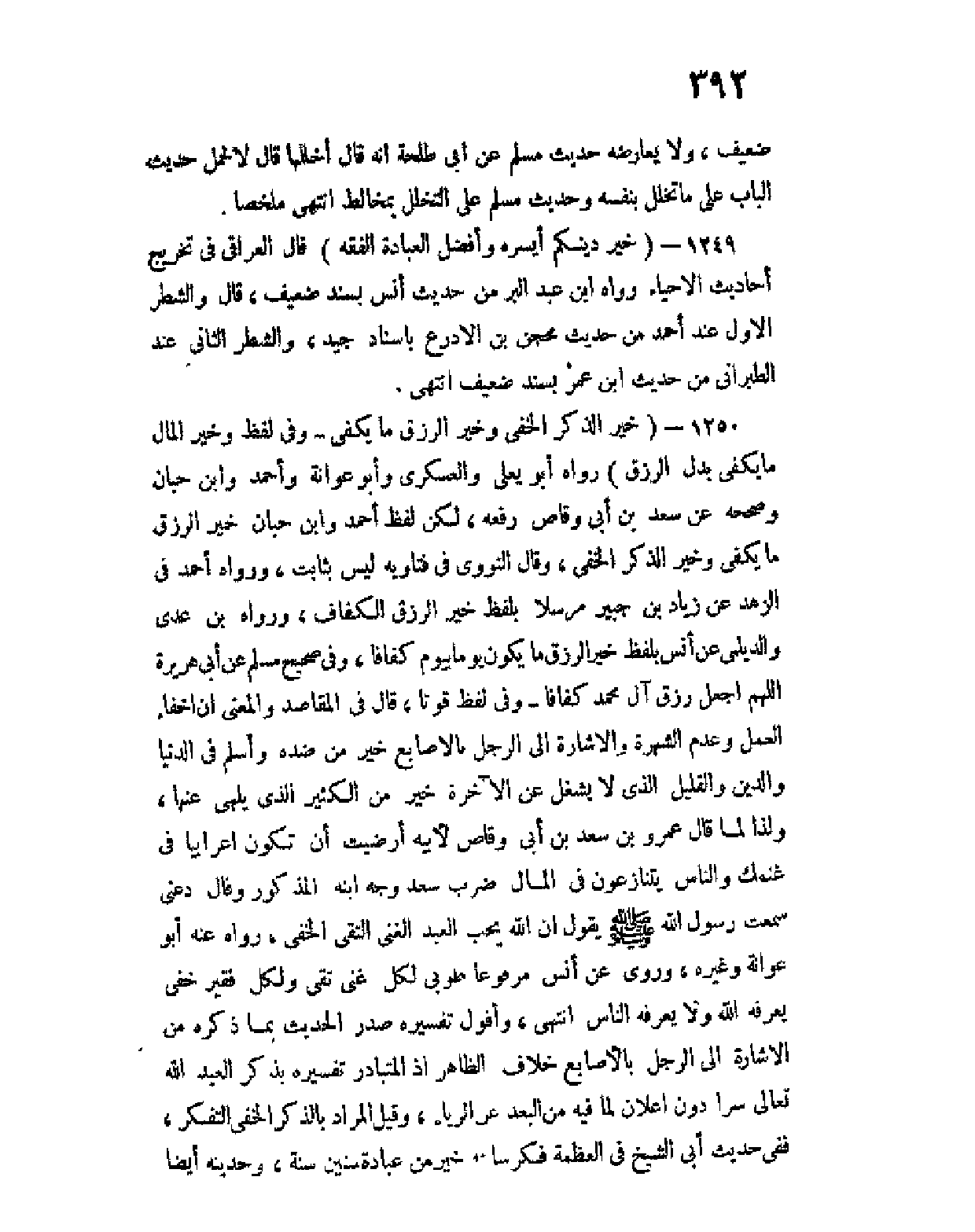 1250 - (خير الذكر الخفي، وخير الرزق ما يكفي - وفي لفظ وخير المال ما يكفي بدل الرزق) رواه أبو يعلى والعسكري وأبو عوانة وأحد وابن حبان وصححه عن سعد بن أبي وقاص رفعه، لكن لفظ أحمد وابن حبان خير الرزق مما يكفي وخير الذكر الخفي، وقال النووي في فتاويه ليس بثابت، ورواه أحمد في الزهد عن زياد بن جبير مرسلا بلفظ خير الرزق الكفاف، ورواه بن عدي والديلمي عن أنس بلفظ خير الرزق ما يكون يوما بيوم كفافا، وفي صحيح مسلم عن أبي هريرة اللهم اجعل رزق آل محمد كفافا - وفي لفظ قوتا، قال في المقاصد والمعنى أن إخفاء العمل وعدم الشهرة والإشارة إلى الرجل بالأصابع خير من ضده، وأسلم في الدنيا والدين، والقليل الذي لا يشغل عن الآخرة خير من الكثير الذي يلهي عنها، ولذا لما قال عمرو بن سعد بن أبي وقاص لأبيه أرضيت أن تكون إعرابيا في غنمك والناس يتنازعون في المال؟ ضرب سعد وجه ابنه المذكور وقال دعني سمعت رسول الله صلى الله عليه وسلم يقول إن الله يحب العبد الغني التقي الخفي، رواه عنه أبو عوانة وغيره، وروي عن أنس مرفوعا طوبى لكل غني تقي ولكل فقير خفي يعرفه الله ولا يعرفه الناس انتهى، وأقول تفسيره صدر الحديث بما ذكره من الإشارة إلى الرجل بالأصابع خلاف الظاهر، إذ المتبادر تفسيره بذكر العبد الله تعالى سرا دون إعلان لما فيه من البعد عن الرياء، وقيل المراد بالذكر الخفي التفكر، ففي حديث أبي الشيخ في العظمة فكر ساعة خير من عبادة ستين سنة، وحديثه أيضا