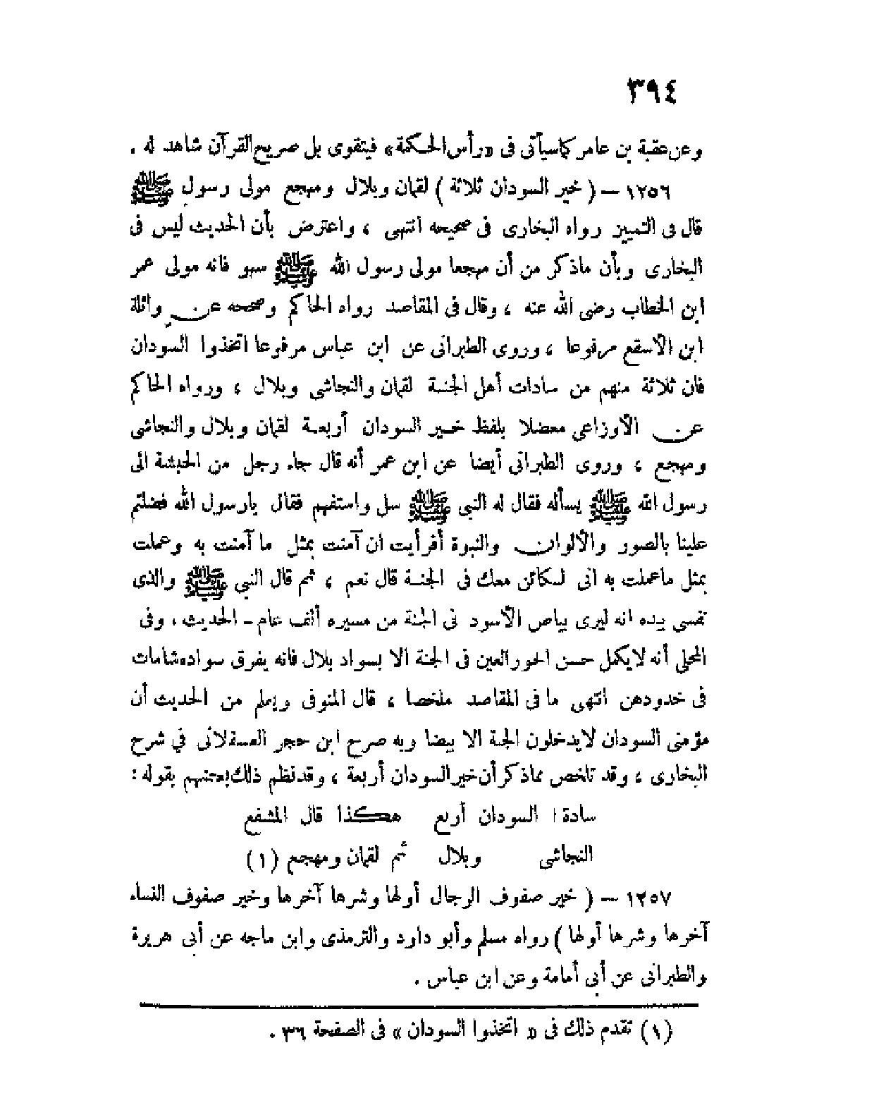 1256 - (خير السودان ثلاثة) لقمان وبلال ومهجع مولى رسول الله صلى الله عليه وسلم قال في التمييز رواه البخاري في صحيحه انتهى، واعترض بأن الحديث ليس في البخاري وبأن ما ذكر من أن مهجعا مولى رسول الله صلى الله عليه وسلم سهو فإنه مولى عمر ابن الخطاب رضي الله عنه، وقال في المقاصد رواه الحاكم وصححه عن واثلة بن الأسقع مرفوعا، وروى الطبراني عن ابن عباس مرفوعا اتخذوا السودان فإن ثلاثة منهم من سادات أهل الجنة لقمان والنجاشي وبلال، ورواه الحاكم عن الأوزاعي معضلا بلفظ خير السودان أربعة لقمان وبلال والنجاشي ومهجع، وروى الطبراني أيضا عن ابن عمر أنه قال جاء رجل من الحبشة إلى رسول الله صلى الله عليه وسلم يسأله فقال له النبي صلى الله عليه وسلم سل واستفهم، فقال يا رسول الله فضلتم علينا بالصور والألوان والنبوة، أفرأيت إن آمنت بمثل ما آمنت به، وعملت بمثل ما عملت به إني لكائن معك في الجنة؟ قال نعم، ثم قال النبي صلى الله عليه وسلم والذي نفسي بيده إنه ليرى بياض الأسود في الجنة من مسيرة ألف عام - الحديث، وفي المحلى أنه لا يكمل حسن الحور العين في الجنة إلا بسواد بلال، فإنه يفرق سواده شامات في خدودهن انتهى ما في المقاصد ملخصا، قال المنوفي ويعلم من الحديث أن مؤمني السودان لا يدخلون الجنة إلا بيضا، وبه صرح ابن حجر العسقلاني في شرح البخاري، وقد تلخص مما ذكر أن خير السودان أربعة، وقد نظم ذلك بعضهم بقوله: