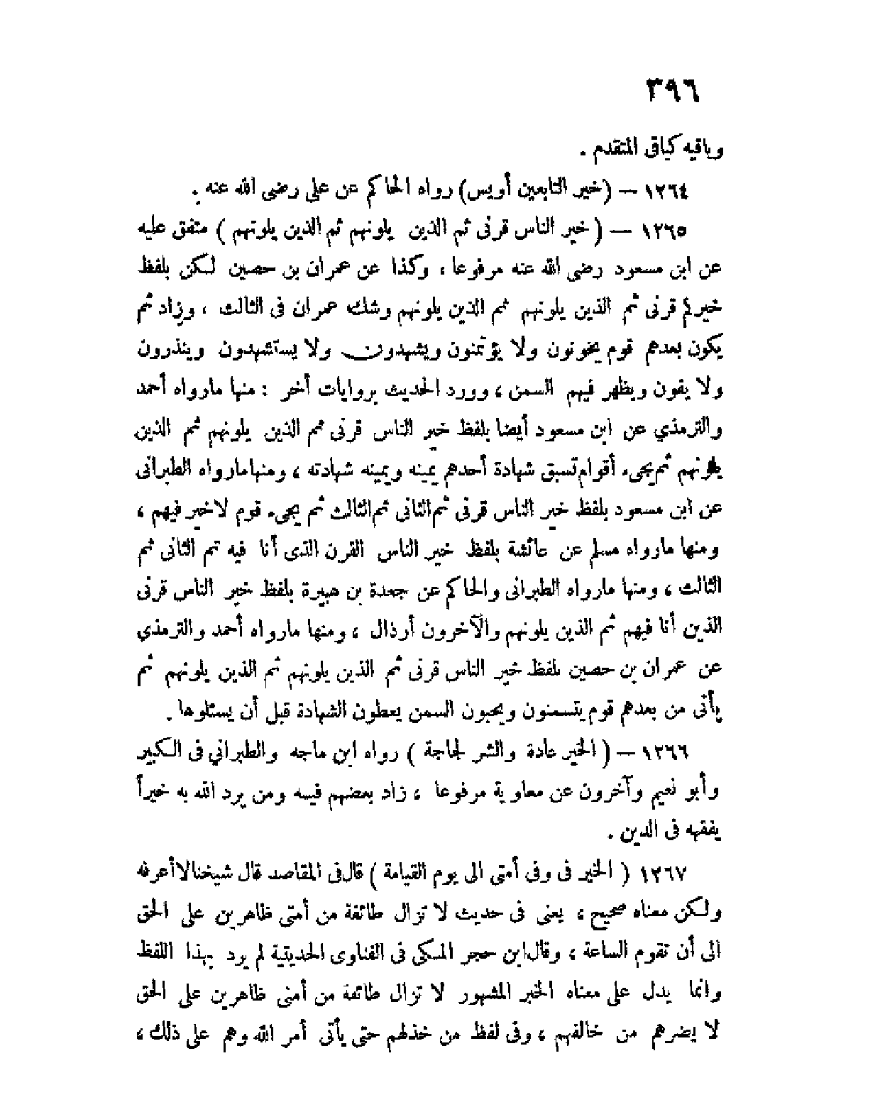 1265 - (خير الناس قرني، ثم الذين يلونهم، ثم الذين يلونهم) متفق عليه عن ابن مسعود رضي الله عنه مرفوعا، وكذا عن عمران بن حصين لكن بلفظ خيركم قرني، ثم الذين يلونهم، ثم الذين يلونهم، وشك عمران في الثالث، وزاد ثم يكون بعدهم قوم يخونون ولا يؤتمنون، ويشهدون ولا يستشهدون، وينذرون ولا يوفون، ويظهر فيهم السمن، وورد الحديث بروايات أخر: منها ما رواه أحمد والترمذي عن ابن مسعود أيضا بلفظ خير الناس قرني، ثم الذين يلونهم، ثم الذين يلونهم، ثم يجئ أقوام، تسبق شهادة أحدهم يمينه، ويمينه شهادته، ومنها ما رواه الطبراني عن ابن مسعود بلفظ خير الناس قرني، ثم الثاني ثم الثالث، ثم يجئ قوم لا خير فيهم، ومنها ما رواه مسلم عن عائشة بلفظ خير الناس القرن الذي أنا فيه، ثم الثاني ثم الثالث، ومنها ما رواه الطبراني والحاكم عن جعدة بن هبيرة بلفظ خير الناس قرني الذين أنا فيهم، ثم الذين يلونهم، والآخرون أرذال، ومنها ما رواه أحمد والترمذي عن عمران بن حصين بلفظ خير الناس قرني، ثم الذين يلونهم، ثم الذين يلونهم ثم يأتي من بعدهم قوم يتسمنون ويحبون السمن، يعطون الشهادة قبل أن يسألوها.