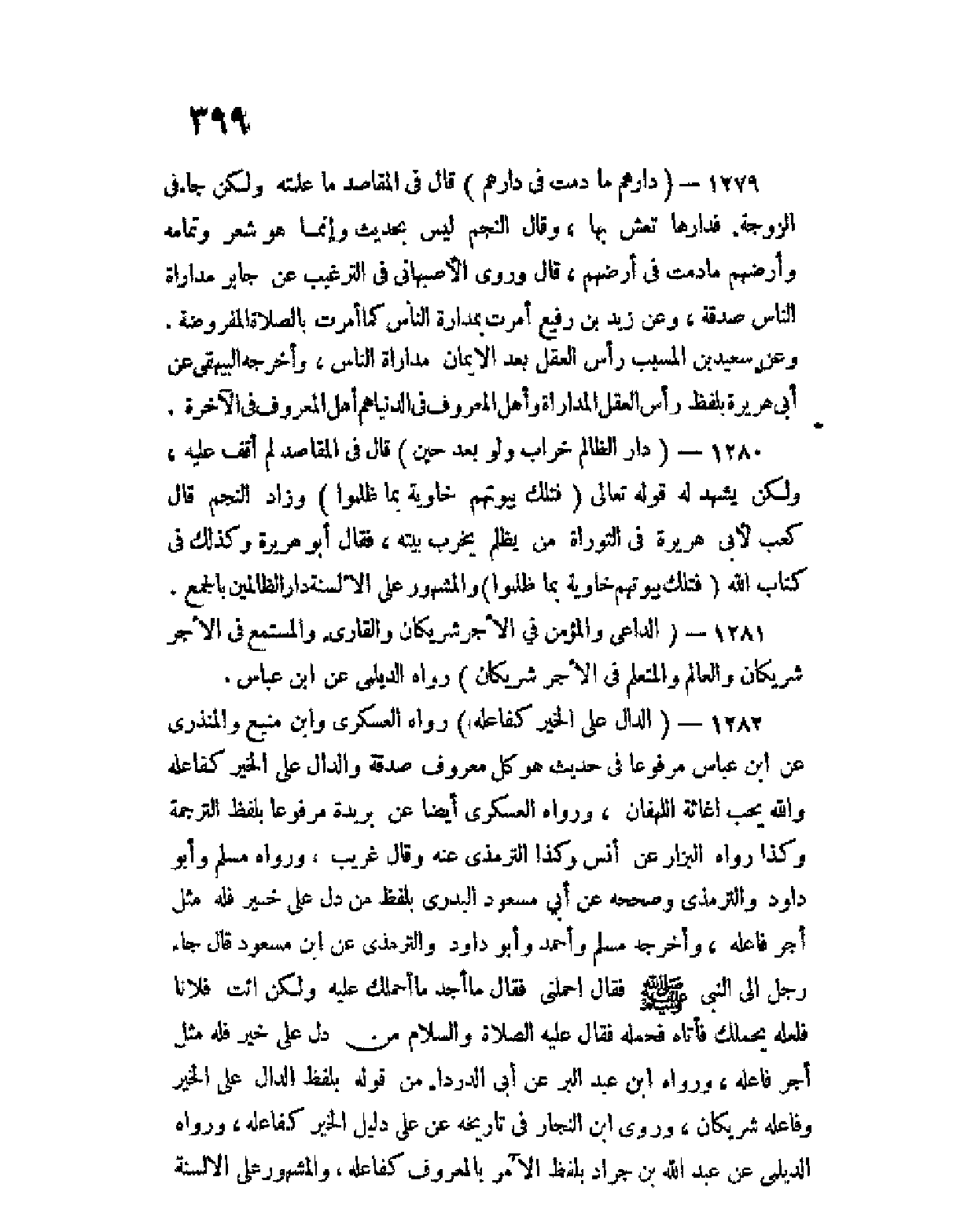 1282 - (الدال على الخير كفاعله) رواه العسكري وابن منيع والمنذري عن ابن عباس مرفوعا في حديث هو كل معروف صدقة، والدال على الخير كفاعله والله يحب إغاثة اللهفان، ورواه العسكري أيضا عن بريدة مرفوعا بلفظ الترجمة وكذا رواه البزار عن أنس، وكذا الترمذي عنه وقال غريب، ورواه مسلم وأبو داود والترمذي وصححه عن أبي مسعود البدري بلفظ من دل على خير فله مثل أجر فاعله، وأخرجه مسلم وأحمد وأبو داود والترمذي عن ابن مسعود قال جاء رجل إلى النبي صلى الله عليه وسلم فقال احملني، فقال ما أجد ما أحملك عليه، ولكن ائت فلانا فلعله يحملك، فأتاه فحمله، فقال صلى الله عليه وسلم من دل على خير فله مثل أجر فاعله، ورواه ابن عبد البر عن أبي الدرداء من قوله بلفظ الدال على الخير وفاعله شريكان، وروى ابن النجار في تاريخه عن علي دليل الخير كفاعله، ورواه الديلمي عن عبد الله بن جراد بلفظ الآمر بالمعروف كفاعله، والشهور على الألسنة