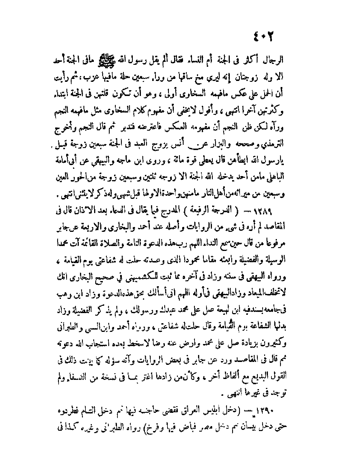 الرجال أكثر في الجنة أم النساء؟ فقال ألم يقل رسول الله صلى الله عليه وسلم ما في الجنة أحد إلا وله زوجتان إنه ليري مخ ساقها من وراء سبعين حلة، ما فيها عزب، ثم رأيت أن الحمل على عكس ما فهمه السخاوي أولى، وهو أن تكون قلتهن في الجنة ابتداء وكثرتهن آخرا، انتهى، وأقول لا يخفى أن مفهوم كلام السخاوي مثل ما فهمه النجم ورآه لكن ظن النجم أن مفهومه العكس فاعترضه فتدبر، ثم قال النجم وأخرج الترمذي وصححه البزار عن أنس يزوج العبد في الجنة سبعين زوجة، قيل يا رسول الله أيطأهن؟ قال يعطى قوة مائة، وروى ابن ماجه والبيهقي عن أبي أمامة الباهلي ما من أحد يدخله الله الجنة إلا زوجه اثنتين وسبعين زوجة من الحور العين وسبعين من ميراثه من أهل النار ما منهن واحدة إلا ولها قبل شهي وله ذكر لا ينثني، انتهى.