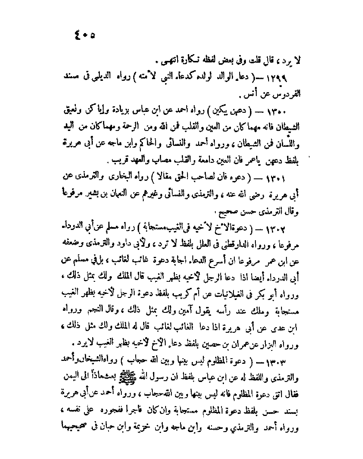 1303 - (دعوة المظلوم ليس بينها وبين الله حجاب) رواه الشيخان وأحمد والترمذي واللفظ له عن ابن عباس بلفظ أن رسول الله صلى الله عليه وسلم بعث معاذا إلى اليمن فقال اتق دعوة المظلوم فإنه ليس بينها وبين الله حجاب، ورواه أحمد عن أبي هريرة بسند حسن بلفظ دعوة المظلوم مستجابة، وإن كان فاجرا، ففجوره على نفسه، ورواه أحمد والترمذي وحسنه وابن ماجه وابن خزيمة وابن حبان في صحيحيهما