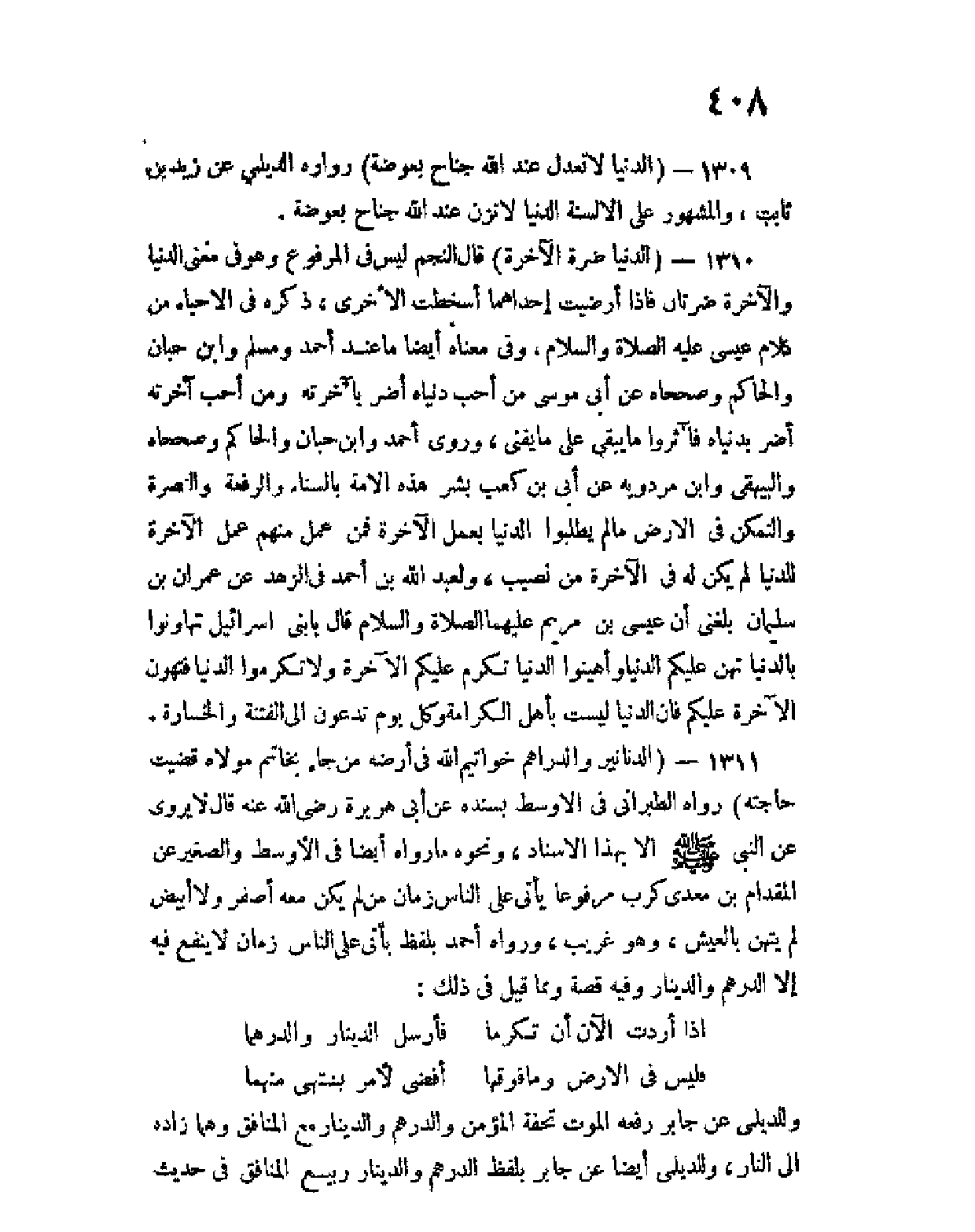 1311 - (الدنانير والدراهم خواتيم الله في أرضه، من جاء بخاتم مولاه قضيت حاجته) رواه الطبراني في الأوسط بسنده عن أبي هريرة رضي الله عنه قال لا يروى عن النبي صلى الله عليه وسلم ألا بهذا الإسناد، ونحوه ما رواه أيضا في الأوسط والصغير عن المقدام بن معدي كرب مرفوعا يأتي على الناس زمان من لم يكن معه أصفر ولا أبيض لم يتهنى بالعيش، وهو غريب، ورواه أحمد بلفظ يأتي على الناس زمان لا ينفع فيه إلا الدرهم والدينار، وفيه قصة ومما قيل في ذلك: