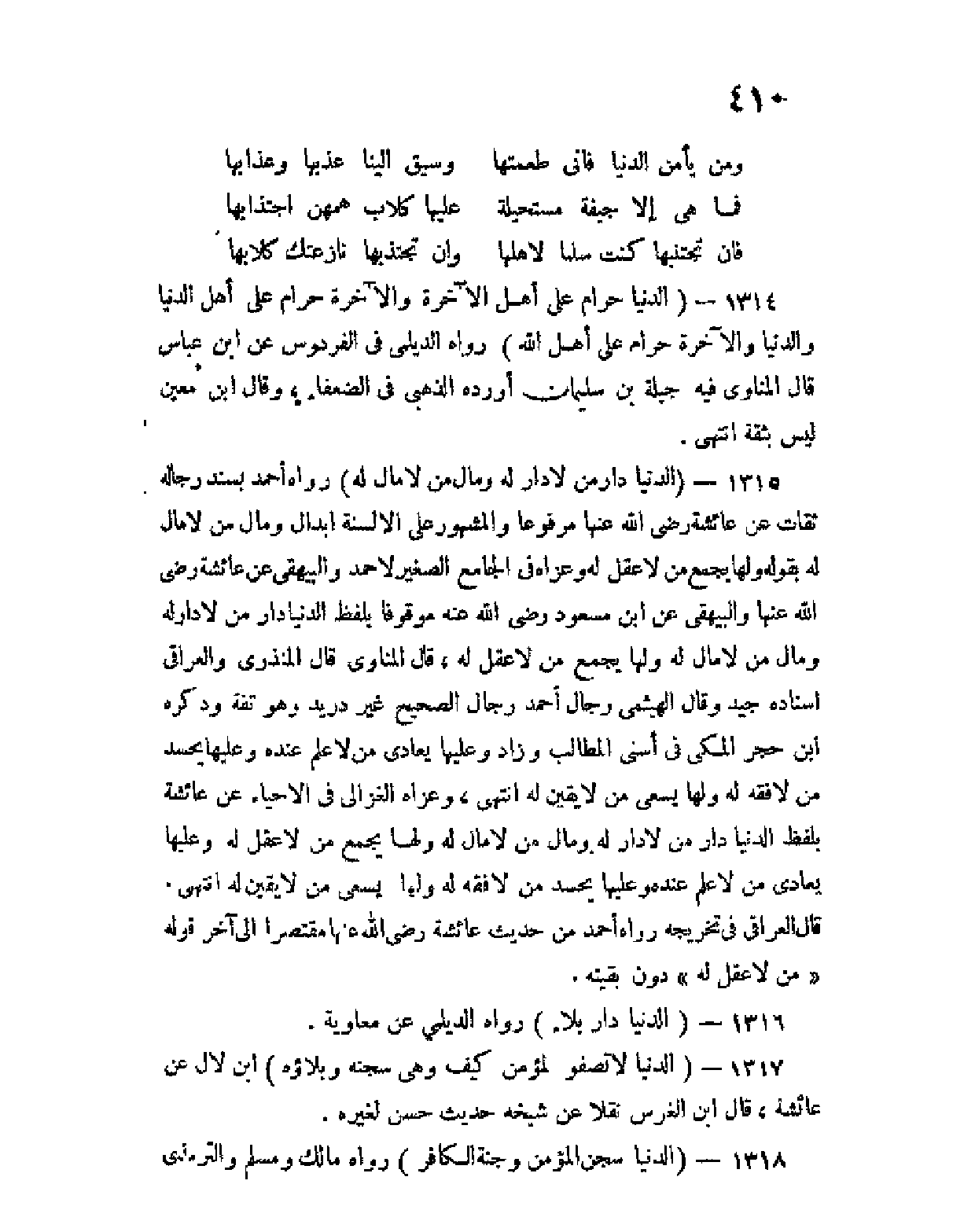 1314 - الدنيا حرام على أهل الآخرة، والآخرة حرام على أهل الدنيا والدنيا والآخرة حرام على أهل الله) رواه الديلمي في الفردوس عن ابن عباس، قال المناوي فيه جبلة بن سليمان أورده الذهبي في الضعفاء، وقال ابن معين ليس بثقة انتهى.