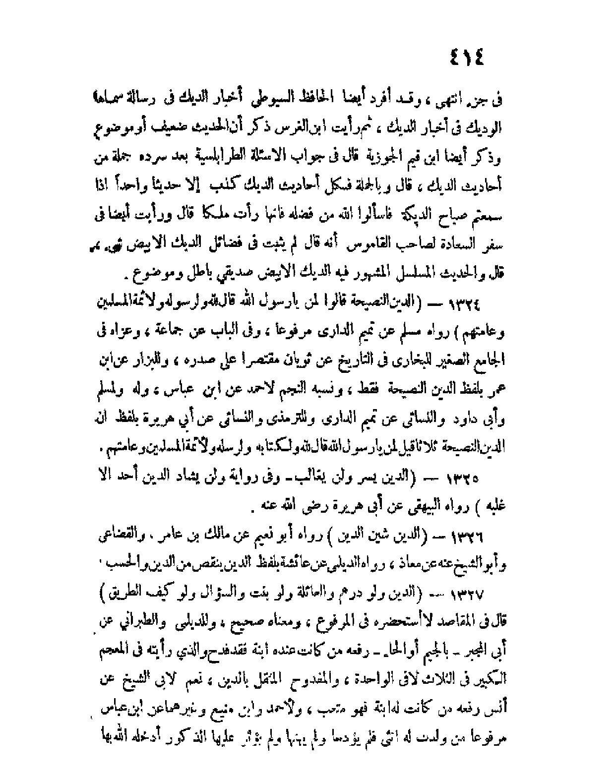 1324 - (الدين النصيحة، قالوا لمن يا رسول الله؟ قال لله ورسوله ولأئمة المسلمين وعامتهم) رواه مسلم عن تميم الداري مرفوعا، وفي الباب عن جماعة، وعزاه في الجامع الصغير للبخاري في التاريخ عن ثوبان مقتصرا على صدره، وللبزار عن ابن عمر بلفظ " الدين النصيحة " فقط، ونسبه النجم لأحمد عن ابن عباس، وله ولمسلم وأبي داود والنسائي عن تميم الداري، وللترمذي والنسائي عن أبي هريرة بلفظ " إن الدين النصيحة " ثلاثا، قيل " لمن يا رسول الله؟ " قال " لله ولكتابه ولرسله ولأئمة المسلمين وعامتهم ".