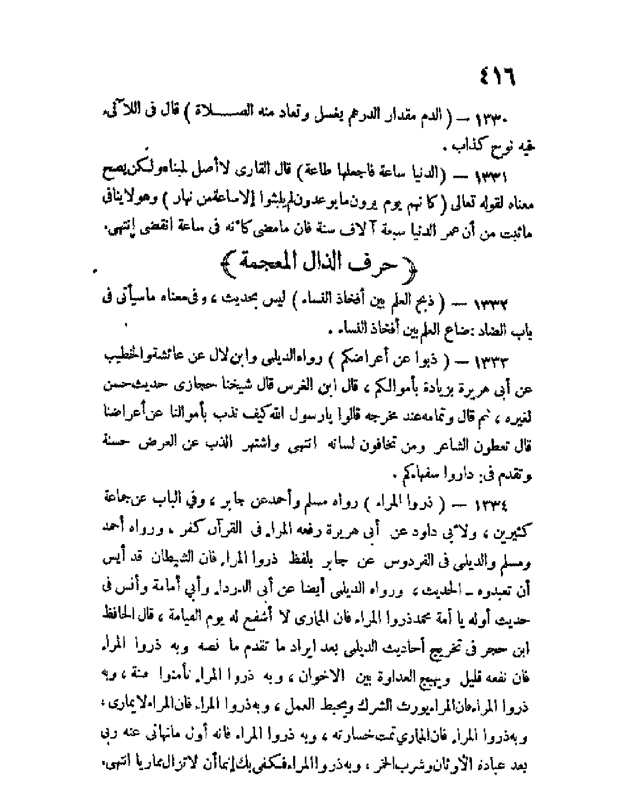 1334 - (ذروا المراء) رواه مسلم وأحمد عن جابر، وفي الباب عن جماعة كثيرين، ولأبي داود عن أبي هريرة رفعه المراء في القرآن كفر، ورواه أحمد ومسلم والديلمي في الفردوس عن جابر بلفظ ذروا المراء، فإن الشيطان قد أيس أن تعبدوه - الحديث، ورواه الديلمي أيضا عن أبي الدرداء وأبي أسامة وأنس في حديث أوله يا أمة محمد ذروا المراء، فإن المماري لا أشفع له يوم القيامة، قال الحافظ ابن حجر في تخريج أحاديث الديلمي بعد إيراد ما تقدم ما نصه: وبه ذروا المراء فإن نفعه قليل، ويهيج العداوة بين الإخوان، وبه ذروا المراء تأمنوا فتنة، وبه ذروا المراء فإن المراء يورث الشرك ويحبط العمل، وبه ذروا المراء فإن المراء لا يمارى، وبه ذروا المراء فإن المماري تمت خسارته، وبه ذروا المراء فإنه أول ما نهاني عنه ربي بعد عبادة الأوثان وشرب الخمر. وبه ذروا المراء فكفى بك إثما أن لا تزال مماريا انتهى.