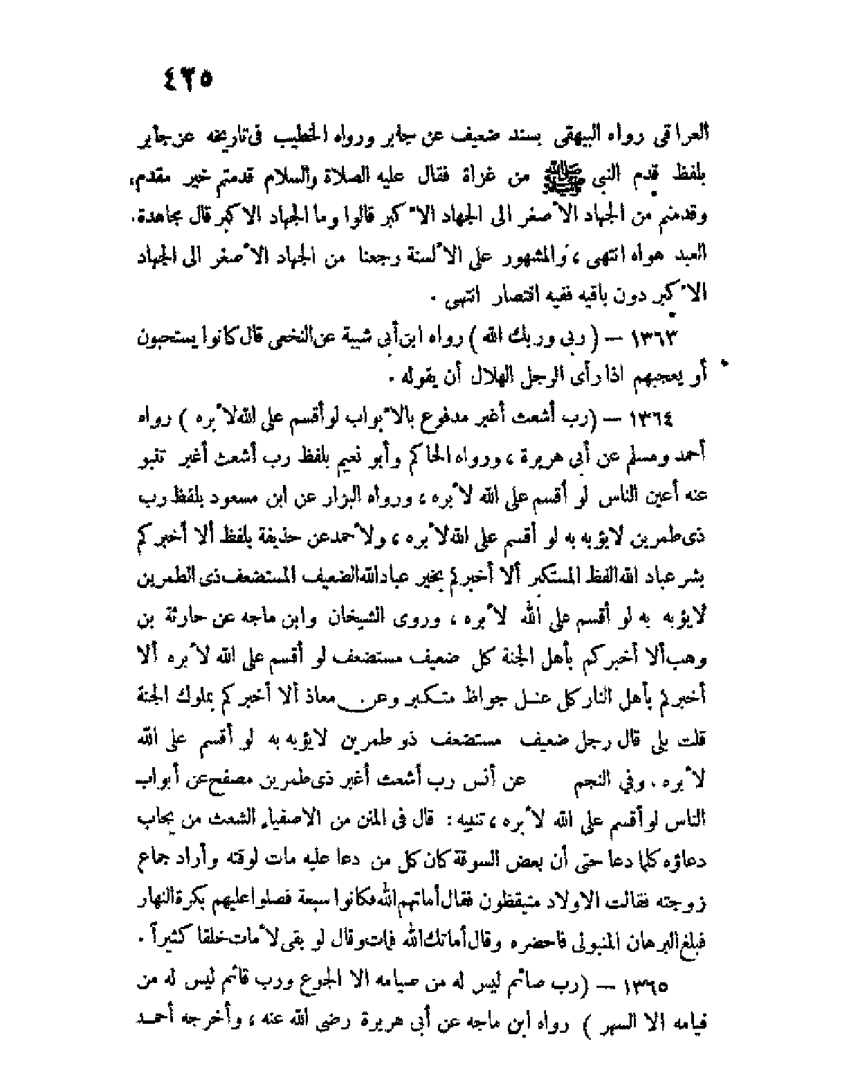 1364 - (رب أشعث أغبر مدفوع بالأبواب لو أقسم على الله لأبره) رواه أحمد ومسلم عن أبي هريرة، ورواه الحاكم وأبو نعيم بلفظ رب أشعث أغبر تنبو عنه أعين الناس لو أقسم على الله لأبره، ورواه البزار عن ابن مسعود بلفظ رب ذي طمرين لا يؤبه به لو أقسم على الله لأبره، ولأحمد عن حذيفة بلفظ ألا أخبركم بشر عباد الله؟ الفظ المستكبر، ألا أخبركم بخير عباد الله؟ الضعيف المستضعف ذي الطمرين لا يؤبه به لو أقسم على الله لأبره، وروى الشيخان وابن ماجه عن حارثة بن وهب ألا أخبركم بأهل الجنة كل ضعيف مستضعف لو أقسم على الله لأبره، ألا أخبركم بأهل النار؟ كل عتل جواظ متكبر، وعن معاذ ألا أخبركم بملوك الجنة قلت بلى قال رجل ضعيف مستضعف ذو طمرين لا يؤبه به لو أقسم على الله لأبره، وفي النجم عن أنس رب أشعث أغبر ذي طمرين مصفح عن أبواب الناس لو أقسم على الله لأبره، تنبيه: قال في المنن من الأصفياء الشعث من يجاب دعاؤه كلما دعا، حتى أن بعض السوقة كان كل من دعا عليه مات لوقته وأراد جماع زوجته فقالت الأولاد متيقظون فقال أماتهم الله فكانوا سبعة فصلوا عليهم بكرة النهار فبلغ البرهان المتبولي فأحضره وقال أماتك الله فمات وقال لو بقي لأمات خلقا كثيرا.
