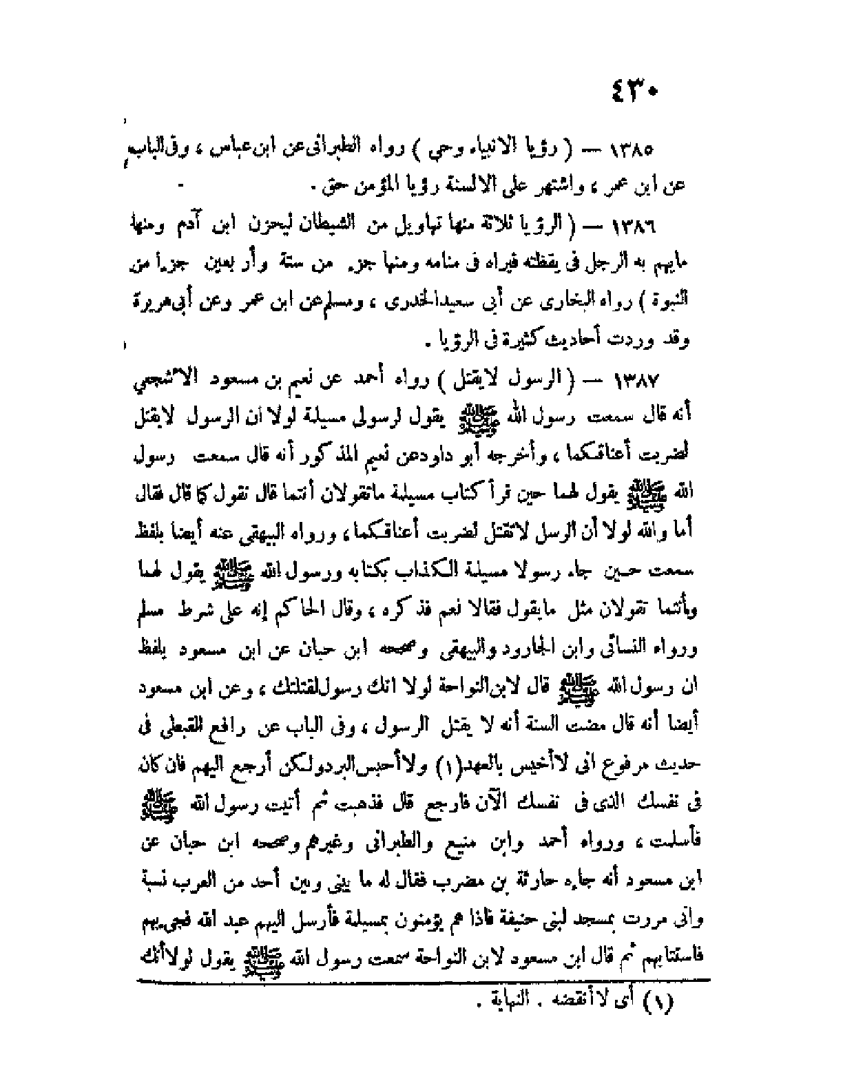 1387 - (الرسول لا يقتل) رواه أحمد عن نعيم بن مسعود الأشجعي أنه قال سمعت رسول الله صلى الله عليه وسلم يقول لرسولي مسيلمة لولا أن الرسول لا يقتل لضربت أعناقكما، وأخرجه أبو داود عن نعيم المذكور أنه قال سمعت رسول الله صلى الله عليه وسلم يقول لهما حين قرأ كتاب مسيلمة ما تقولان أنتما قال نقول كما قال فقال أما والله لولا أن الرسل لا تقتل لضربت أعناقكما، ورواه البيهقي عنه أيضا بلفظ سمعت حين جاء رسولا مسيلمة الكذاب بكتابه ورسول الله صلى الله عليه وسلم يقول لهما وأنتما تقولان مثل ما يقول فقالا نعم فذكره، وقال الحاكم أنه على شرط مسلم ورواه النسائي وأبن الجارود والبيهقي وصححه ابن حبان عن ابن مسعود بلفظ أن رسول الله صلى الله عليه وسلم قال لابن النواحة لولا أنك رسول لقتلتك، وعن ابن مسعود أيضا أنه قال مضت السنة أنه لا يقتل الرسول، وفي الباب عن رافع القبطي في حديث مرفوع إني لا أخيس بالعهد (¬1) ولا أحبس البرد ولكن أرجع إليهم فإن كان في نفسك الذي في نفسك الآن فارجع قال فذهبت ثم أتيت رسول الله صلى الله عليه وسلم فأسلمت، ورواه أحمد وابن منيع والطبراني وغيرهم وصححه ابن حبان عن ابن مسعود أنه جاءه حارثة بن مضرب فقال له ما بيني وبين أحد من العرب نسبة وإني مررت بمسجد لبني حنيفة فإذا هم يؤمنون بمسيلمة فأرسل إليهم عبد الله فجئ بهم فاستتابهم ثم قال ابن مسعود لابن النواحة سمعت رسول الله صلى الله عليه وسلم يقول لولا أنك