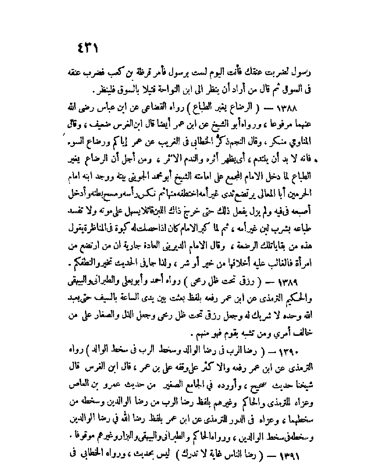 1390 - (رضا الرب في رضا الوالد وسخط الرب في سخط الوالد) رواه الترمذي عن ابن عمر رفعه والأكثر علي وقفه على بن عمر، قال ابن الغرس قال شيخنا حديث صحيح، وأورده في الجامع الصغير من حديث عَمْرو بن العاص وعزاه للترمذي والحاكم وغيرهم بلفظ " رضا الرب من رضا الوالدين وسخطه من سخطهما، وعزاه في الدرر للترمذي عن ابن عمر بلفظ " رضا الله في رضا الوالدين وسخطه في سخط الوالدين " ورواه الحاكم والطبراني والبيهقي والبزار وغيرهم موقوفا.