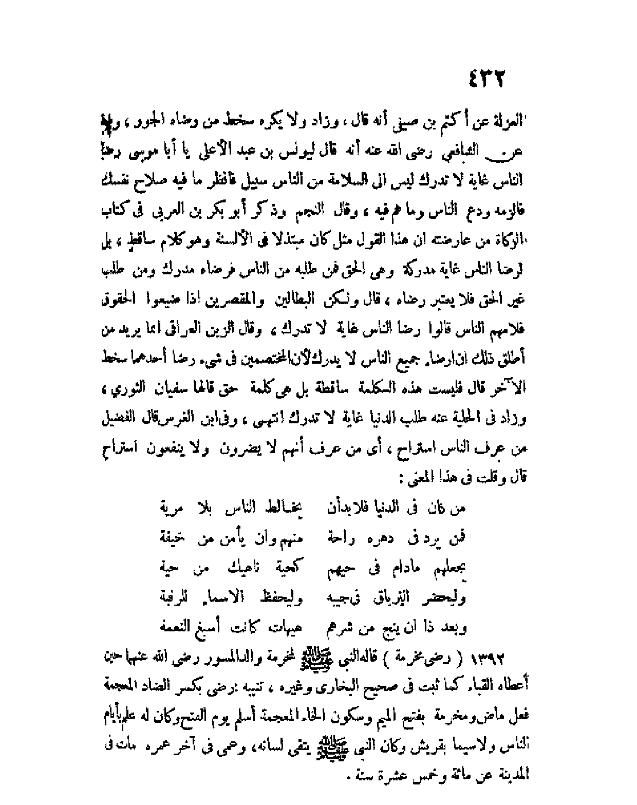 العزلة عن أكتم بن صيفي أنه قال، وزاد ولا يكره سخط من رضاه الجور، وفيه عن الشافعي رضي الله عنه أنه قال ليونس بن عبد الأعلى يا أبا موسى رضا الناس غاية لا تدرك ليس إلى السلامة من الناس سبيل فانظر ما فيه صلاح نفسك فالزمه ودع الناس وما هم فيه، وقال النجم وذكر أبو بكر بن العربي في كتاب الزكاة من عارضته أن هذا القول مثل كان مبتذلا في الألسنة وهو كلام ساقط، بل لرضا الناس غاية مدركة وهي الحق فمن طلبه من الناس فرضاه مدرك ومن طلب غير الحق فلا يعتبر رضاه، قال ولكن البطالين والمقصرين إذا ضيعوا الحقوق فلامهم الناس قالوا رضا الناس غاية لا تدرك، وقال الزين العراقي إنما يريد من أطلق ذلك إن إرضاء جميع الناس لا يدرك لأن المختصمين في شئ رضا أحدهما سخط الآخر قال فليست هذه الكلمة ساقطة بل هي كلمة حق قالها سفيان الثوري، وزاد في الحلية عنه طلب الدنيا لا تدرك انتهى، وفي ابن الغرس قال الفضيل من عرف الناس استراح، أي من عرف أنهم لا يضرون ولا ينفعون استراح قال وقلت في هذا المعنى: