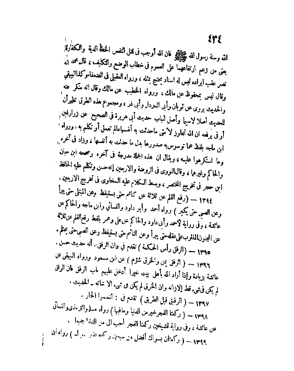 1394 - (رفع القلم عن ثلاثة عن النائم حتى يستيقظ وعن المبتلى حتى يبرأ وعن الصبي حتى يكبر) رواه أحمد وأبو داود والنسائي وابن ماجه والحاكم عن عائشة، وفي رواية لأحمد وأبي داود والحاكم عن علي وعمر بلفظ رفع القلم عن ثلاثة عن المجنون المغلوب على عقله حتى يبرأ وعن النائم حتى يستيقظ وعن الصبي حتى يحتلم.