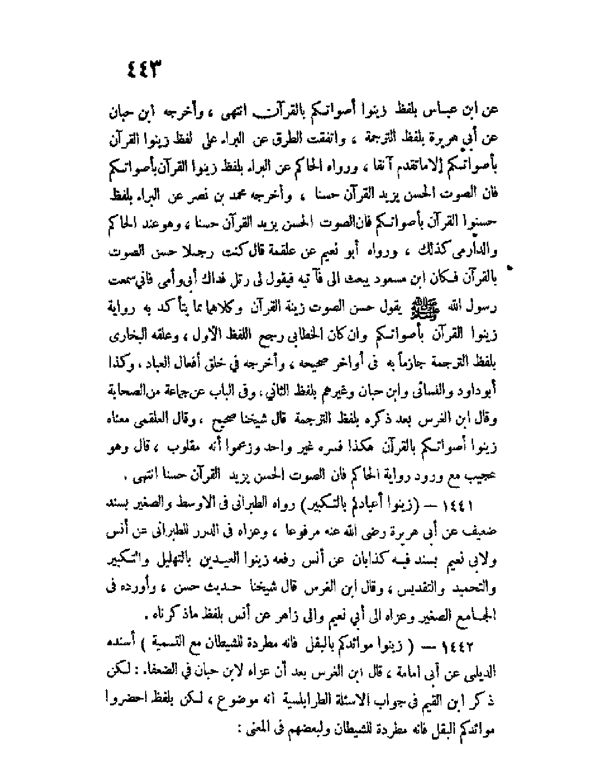 1441 - (زينوا أعيادكم بالتكبير) رواه الطبراني في الأوسط والصغير بسند ضعيف عن أبي هريرة رضي الله عنه مرفوعا، وعزاه في الدرر للطبراني عن أنس ولأبي نعيم بسند فيه كذابان عن أنس رفعه زينوا العيدين بالتهليل والتكبير والتحميد والتقديس، وقال ابن الغرس قال شيخنا حديث حسن، وأورده في الجامع الصغير وعزاه إلى أبي نعيم وإلى زاهر عن أنس بلفظ ما ذكرناه.