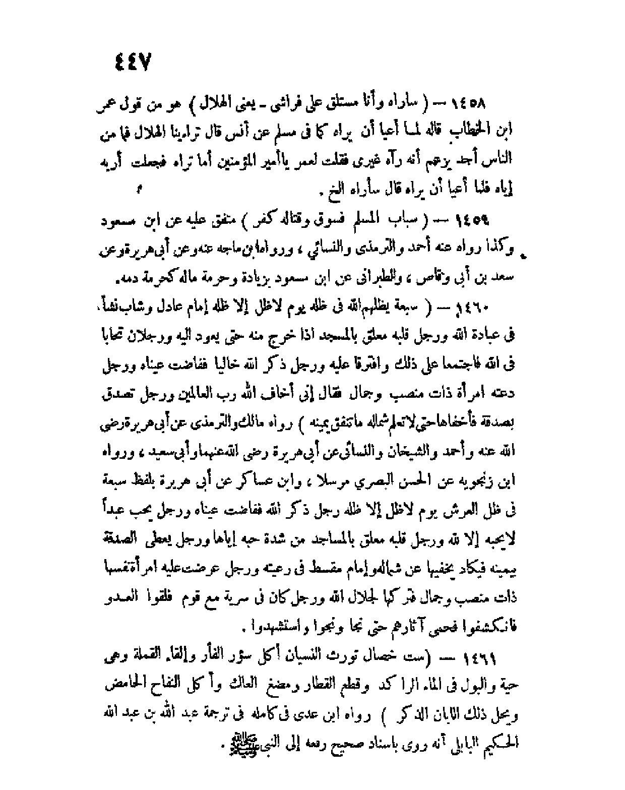 1459 - (سباب المسلم فسوق وقتاله كفر) متفق عليه عن ابن مسعود وكذا رواه عنه الترمذي والنسائي، ورواه ابن ماجه عنه وعن أبي هريرة وعن سعد بن أبي وقاص، والطبراني عن ابن مسعود بزيادة وحرمة ماله كحرمة دمه.