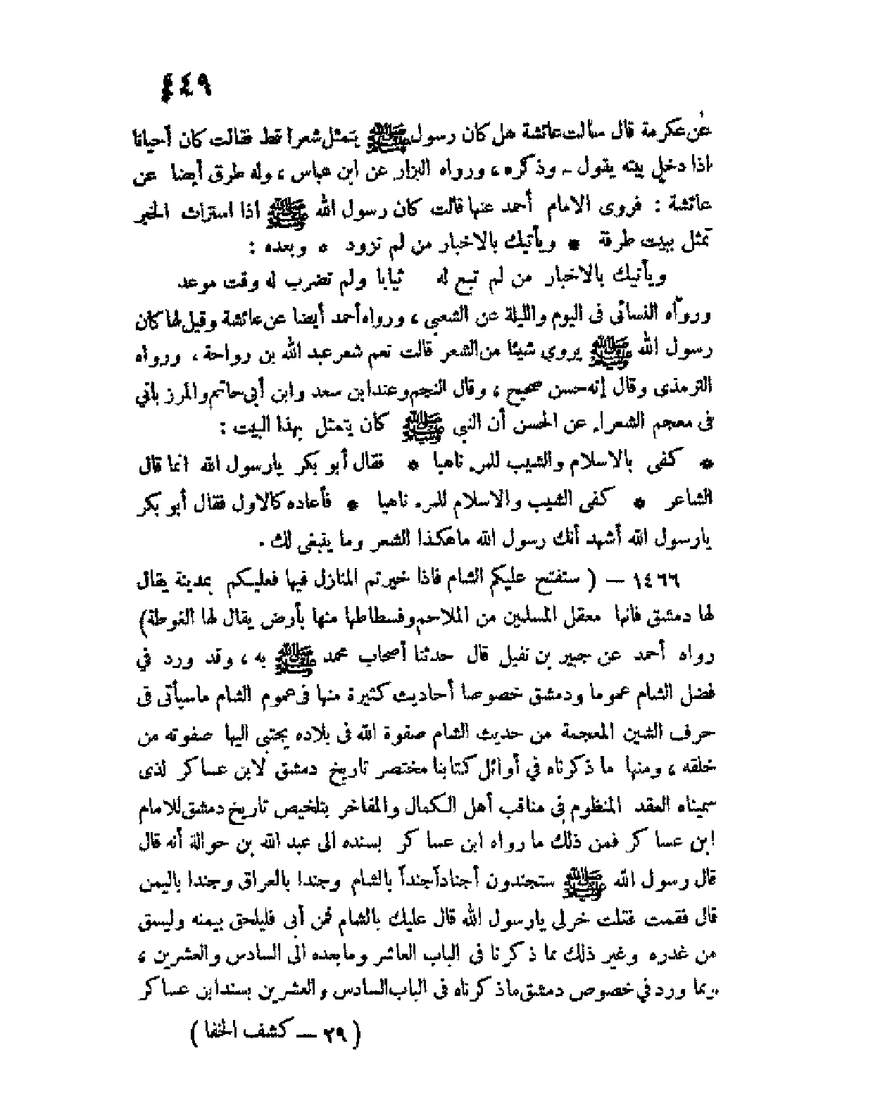 1466 - (ستفتح عليك الشام فإذا خيرتم المنازل فيها فعليكم بمدينة يقال لها دمشق فإنها معقل المسلمين من الملاحم وفسطاطها منها بأرض يقال لها الغوطة) رواه أحمد عن جبير بن نفيل قال حدثنا أصحاب محمد صلى الله عليه وسلم به، وقد ورد في فضل الشام عموما ودمشق خصوصا أحاديث كثيرة منها في عموم الشام ما سيأتي في حرف الشين المعجمة من حديث الشام صفوة الله في بلاده يجتبي إليها صفوته من خلقه، ومنها ما ذكرناه في أوائل كتابنا مختصر تاريخ دمشق لابن عساكر الذي سميناه العقد المنظوم في مناقب أهل الكمال والمفاخر بتلخيص تاريخ دمشق للإمام ابن عساكر فمن ذلك ما رواه ابن عساكر بسنده إلى عبد الله بن حوالة أنه قال قال رسول الله صلى الله عليه وسلم ستجندون أجنادا جندا بالشام وجندا بالعراق وجندا باليمن قال فقمت فقالت خر لي يا رسول الله قال عليك بالشام فمن أبى فليحق بيمنه وليسق من غدره وغير ذلك مما ذكرنا في الباب العاشر وما بعده إلى السادس والعشرين، ومما ورد في خصوص دمشق ما ذكرناه في الباب السادس والعشرين بسند ابن عساكر