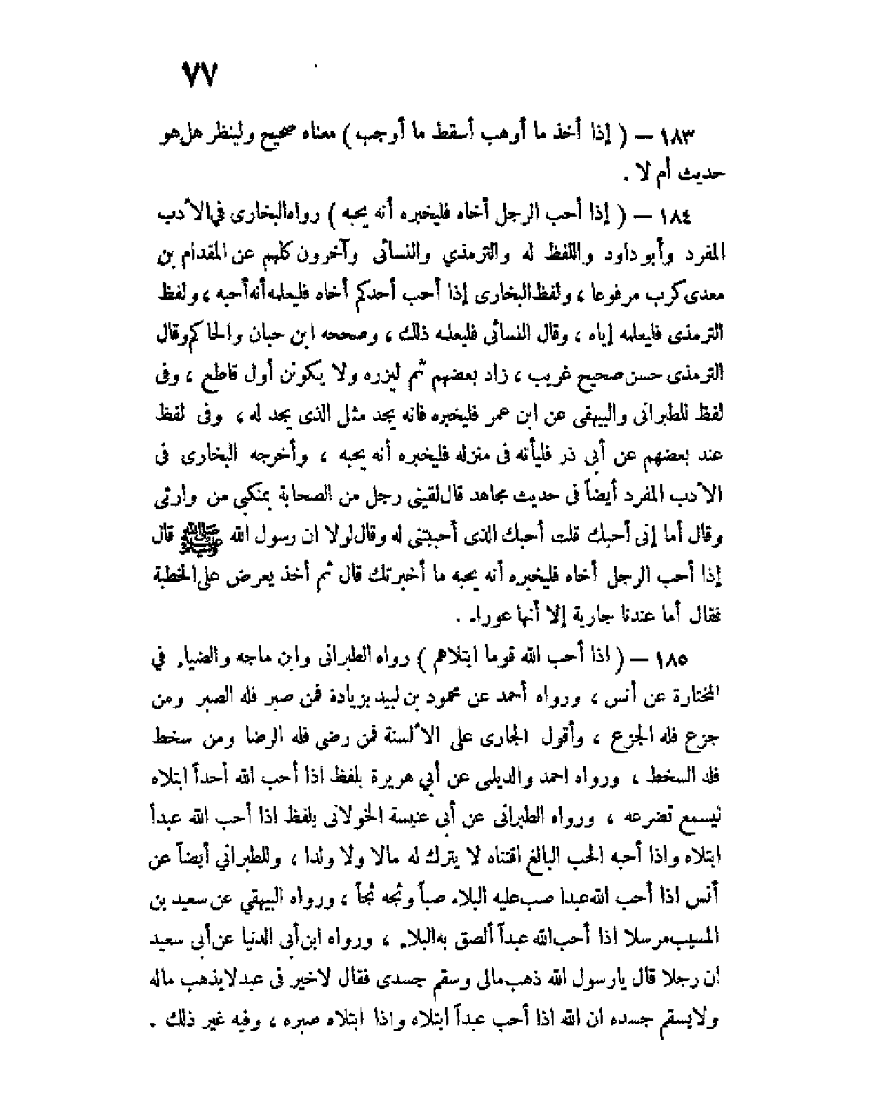 185 - (إذا أحب الله قوما ابتلاهم) رواه الطبراني وابن ماجه والضياء في المختارة عن أنس، ورواه أحمد عن محمود بن لَبيد بزيادة فمن صبر فله الصبر ومن جزع فله الجَزَع، وأقول الجاري على الألسنة فمن رضي فله الرضا ومن سخط فله السخط، ورواه أحمد والديلمي عن أبي هريرة بلفظ إذا أحب الله أحدا ابتلاه ليسمع تضرعه، ورواه الطبراني عن أبي عنبسة الخولاني بلفظ إذا أحب الله عبدا ابتلاه وإذا أحبه الحب البالغ اقتناه لا يترك له مالاً ولا ولدا، وللطبراني أيضا عن أنس إذا أحب الله عبدا صب عليه البلاء صبا وثجه ثجا، ورواه البيهقي عن سعيد بن المسيب مرسلا إذا أحب الله عبدا ألصق به البلاء، ورواه ابن أبي الدنيا عن أبي سعيد أن رجلا قال يا رسول الله ذهب مالي وسقم جسدي فقال لا خير في عبد لا يذهب ماله ولا يسقم جسده إن الله إذا أحب عبدا ابتلاه وإذا ابتلاه صبره، وفيه غير ذلك.