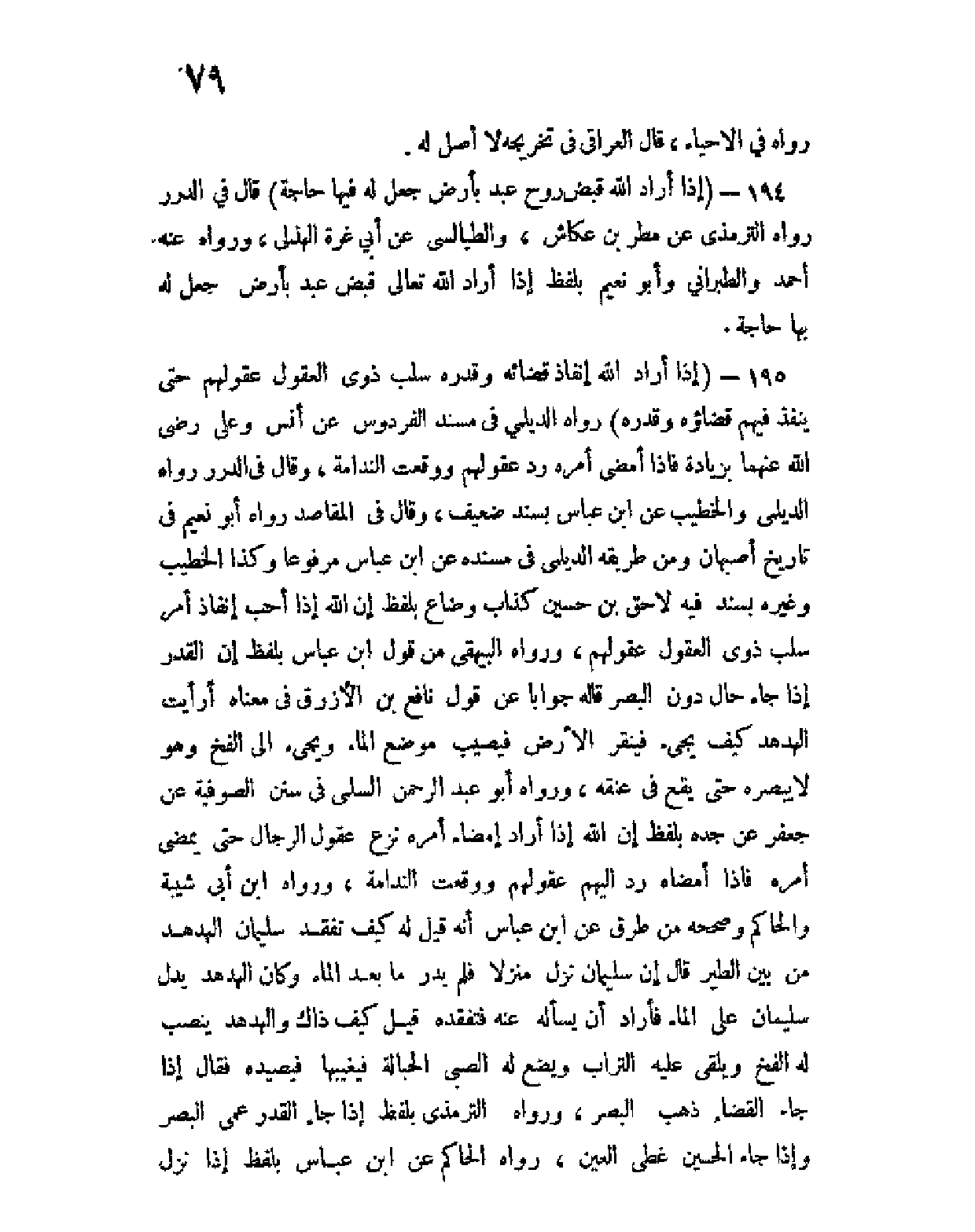 195 - (إذا أراد الله إنفاذ قضائه وقدره سلب ذوي العقول عقولهم حتى يَنْفُذ فيهم قضاؤهُ وقدرَهُ) رواه الديلمي في مسند الفردوس عن أنس وعلي رضي الله عنهما بزيادة فإذا أمضى أمره رد عقولهم ووقعت الندامة، وقال في الدرر رواه الديلمي والخطيب عن ابن عباس بسند ضعيف، وقال في المقاصد رواه أبو نعيم في تاريخ أصبهان ومن طريقه الديلمي في مسنده عن ابن عباس مرفوعا وكذا الخطيب وغيره بسند فيه لاحق بن حسين كذاب وضاع بلفظ أن الله إذا أحب إنفاذ أمر سلب ذوي العقول عقولهم، ورواه البيهقي من قول ابن عباس بلفظ إن القدر إذا جاء حال دون البصر قاله جوابا عن قول نافع بن الأزرق في معناه أرأيت الهدهد كيف يجئ فينقر الأرض فيصيب موقع الماء ويجئ إلى الفخ وهو لا يبصره حتى يقع في عنقه ورواه أبو عبد الرحمن السلمي في سنن الصوفية عن جعفر عن جده بلفظ إن الله إذا أراد إمضاء أمره نزع عقول الرجال حتى يمضي أمره فإذا أمضاه رد إليهم عقولهم ووقعت الندامة، ورواه ابن أبي شيبة والحاكم وصححه من طرق عن ابن عباس أنه قيل له كيف تفقد سليمان الهدهد من بين الطير قال إن سليمان نزل منزلا فلم يدر ما بُعْدُ الماء وكان الهدهد يدل سليمان على الماء فأراد أن يسأله عنه فتفقده قيل كيف ذاك والهدهد ينصب له الفخ ويلقى عليه التراب ويضع له الصبي الحبالة فيُغَيِّبها فيصيده فقال إذا جاء القضاء ذهب البصر، ورواه الترمذي بلفظ إذا جاء القدر عمي البصر وإذا جاء الحَيْن غطى العَيْن، رواه الحاكم عن ابن عباس بلفظ إذا نزل
