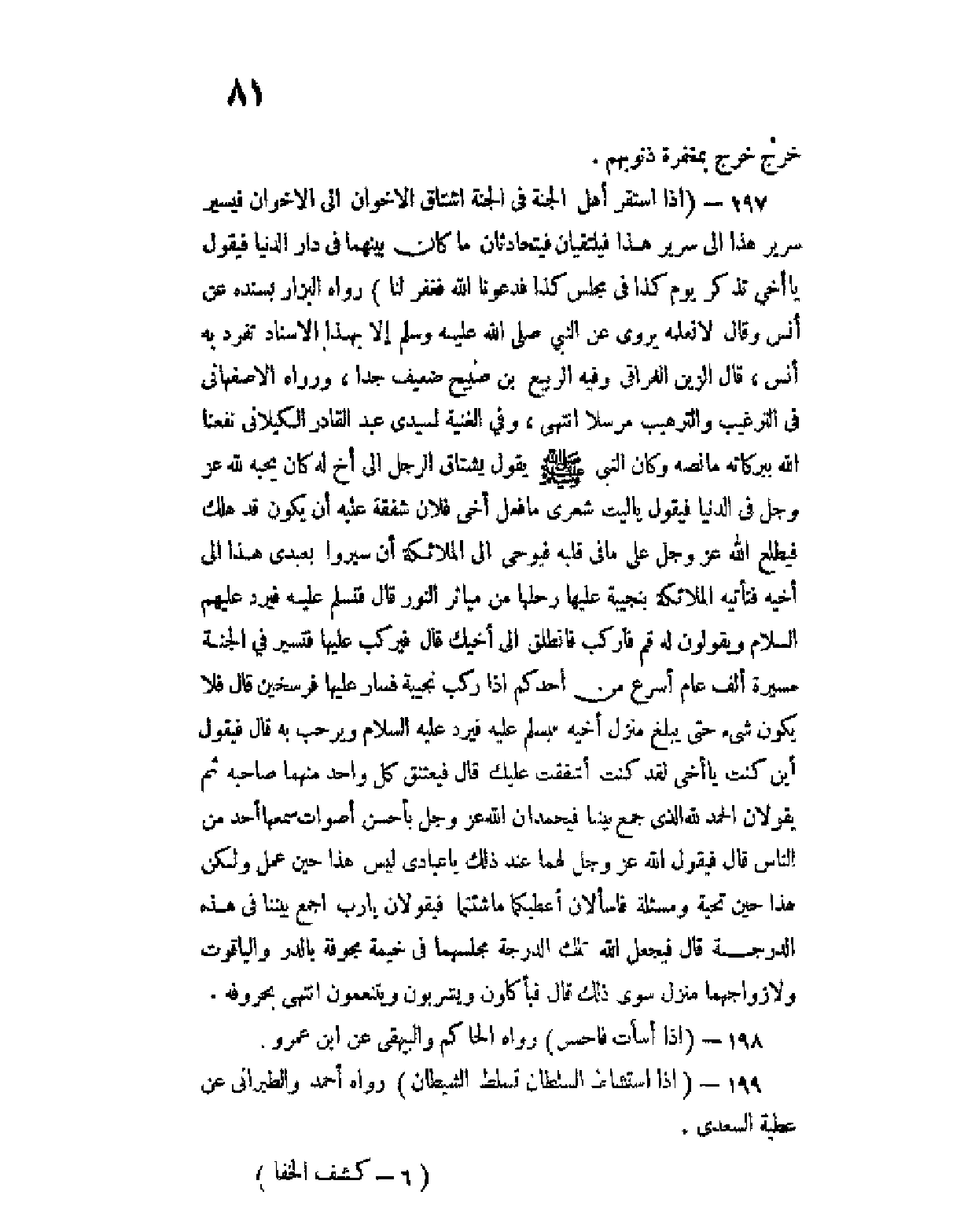 197 - (إذا استقر أهل الجنة في الجنة اشتاق الإخوان إلى الإخوان فيسير سرير هذا إلى سرير هذا فيلتقيان فيتحادثان ما كان بينهما في دار الدنيا فيقول يا أخي تذكر يوم كذا في مجلس كذا فدعونا الله فغفر لنا) رواه البزار بسنده عن أنس وقال لا نعلمه يروى عن النبي صلى الله عليه وسلم إلا بهذا السند تفرد به أنس، قال الزين العراقي وفيه الربيع بن صبيح ضعيف جدا، ورواه الأصفهاني في الترغيب والترهيب مرسلا انتهى، وفي الغنية لسيدي عبد القادر الكيلاني نفعنا الله ببركاته ما نصه وكان النبي صلى الله عليه وسلم يقول يشتاق الرجل إلى أخ له كان يحبه لله عز وجل في الدنيا فيقول يا ليت شعري ما فعل أخي فلان شفقة عليه أن يكون قد هلك فيطلع الله عز وجل على ما في قلبه فيوحي إلى الملائكة أن سيروا بعبدي هذا إلى أخيه فتأتيه الملائكة بنجيبة عليها رحلها من مياثر النور قال فتسلم عليه فيرد عليهم السلام ويقولون له قم فاركب فانطلق إلى أخيك قال فيركب عليها فتسير في الجنة مسيرة ألف عام أسرع من أحدكم إذا ركب نجيبة فسار عليها فرسخين قال فلا يكون شئ حتى يبلغ منزل أخيه فيسلم عليه فيرد عليه السلام ويرحب به قال فيقول أين كنت يا أخي لقد كنت أشفقت عليك قال فيعتنق كل واحد منها صاحبه ثم يقولان الحمد لله الذي جمع بيننا فيحمدان الله عز وجل بأحسن أصوات سمعها أحد من الناس قال فيقول الله عز وجل لهما عند ذلك يا عبادي ليس هذا حين عمل ولكن هذا حين تحية ومسألة فاسألا أعطيكما ما شئتما فيقولان يا رب اجمع بيننا في هذه الدرجة قال فيجعل الله تلك الدرجة مجلسهما في خيمة مجوفة بالدر والياقوت ولازواجهما منزل سوى ذلك قال فيأكلون ويشربون ويتنعمون انتهى بحروفه.