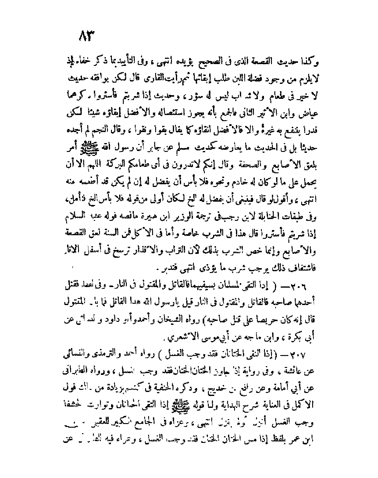 207 - (إذا التقى الخِتانانِ فقد وجب الغسلُ) رواه أحمد والترمذي والنسائي عن عائشة، وفي رواية إذا جاوز الختان الختان فقد وجب الغسل، ورواه الطبراني عن أبي أمامة ورافع بن خَديج، وذكره الحنفيَّة في كتبهم بزيادة من ذلك قول الأكمل في العناية شرح الهداية ولنا قوله صلى الله عليه وسلم إذا التقى الختانان وتوارت الحشفة وجب الغسل أنزل أو لم ينزل انتهى، وعزاه في الجامع الكبير للعقيلي عن ابن عمر بلفظ إذا مس الختان الختان فقد وجب الغسل، وعزاه فيه للطبراني