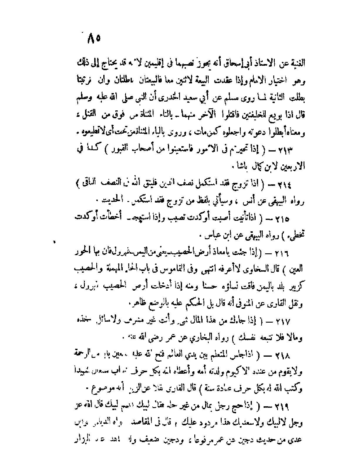 216 - (إذا جئتُ يا مُعاذ أرض الحُصَيب - يعني من اليمن - فهَرْوِلْ فإن بها الحُورَ العينَ) قال السخاوي لا أعرفه انتهى وفي القاموس في باب الحاء المهملة والحصيب كزبير بلد باليمن فاقت نساؤه حسنا ومنه إذا أدخلت أرض الحصيب فهرول، ونقل القاري عن المنوفي أنه قال بل الحكم عليه بالوضع ظاهر.