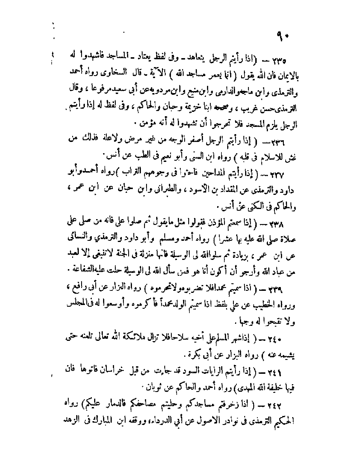 237 - (إذا رأيتم المداحين فاحثوا في وجوههم التراب) رواه أحمد وأبو داود والترمذي عن المقداد بن الأسود، والطبراني وابن حبان عن ابن عمر، والحاكم في الكِنى عن أنس.