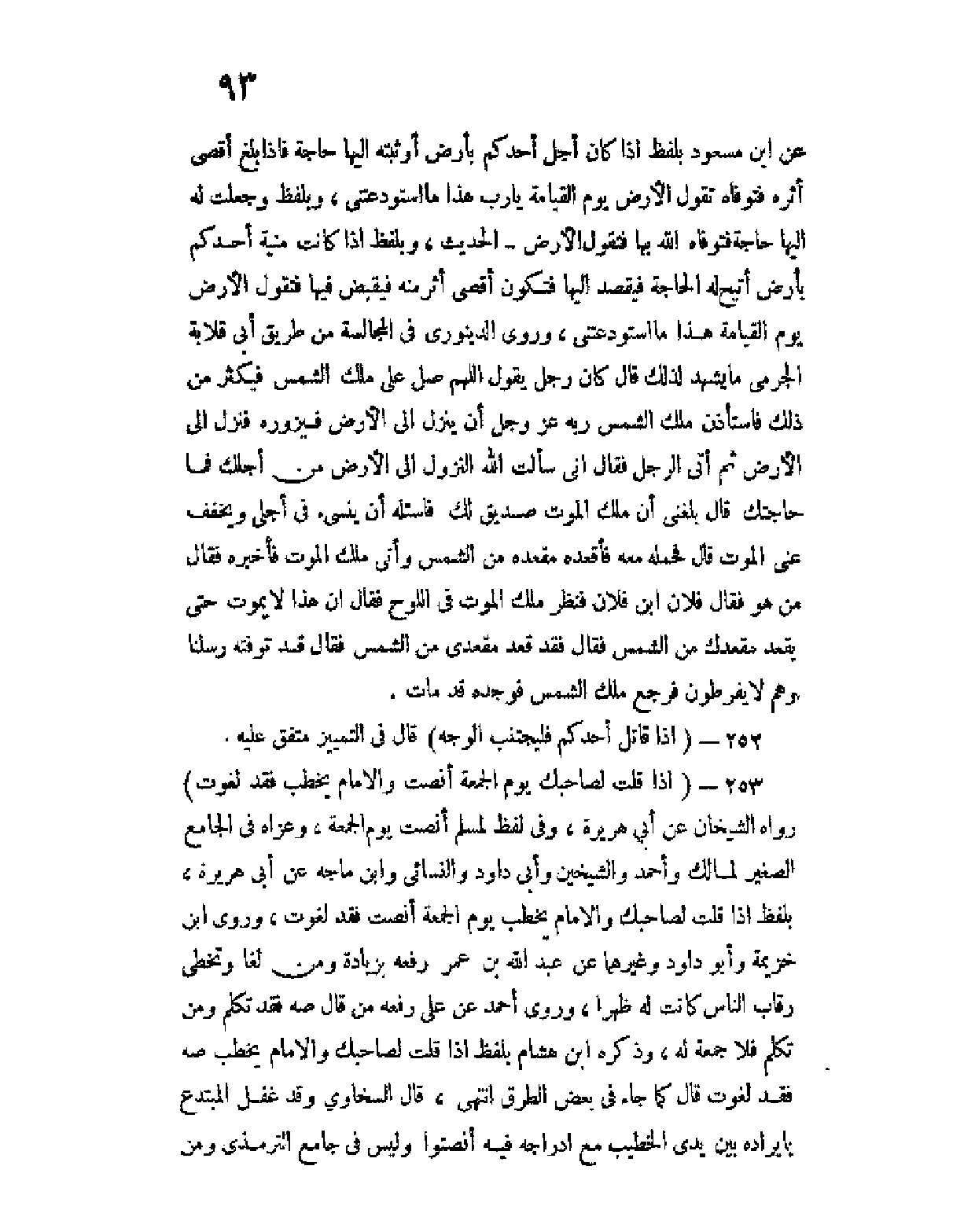 253 - (إذا قلت لصاحبك يوم الجمعة أنصت والإمامُ يَخطب فقد لَغَوْتَ) رواه الشيخان عن أبي هريرة، وفي لفظ لمسلم أنصت يوم الجمعة، وعزاه في الجامع الصغير لمالك وأحمد والشيخين وأبي داود والنسائي وابن ماجه عن أبي هريرة، بلفظ إذا قلت لصاحبك والإمام يخطب يوم الجمعة أنصت فقد لغوت، وروى ابن خزيمة وأبو داود وغيرهما عن عبد الله بن عمر رفعه بزيادة ومن لغا وتخطى رقاب الناس كانت له ظهرا، وروى أحمد عن علي رفعه من قال صه فقد تكلم ومن تكلم فلا جمعة له، وذكره ابن هشام بلفظ إذا قلت لصاحبك والإمام يخطب صه فقد لغوت قال كما جاء في بعض الطرق انتهى، قال السخاوي وقد غفل المبتدع بإيراده بين يدي الخطيب مع إدراجه فيه أنصتوا وليس في جامع الترمذي ومن