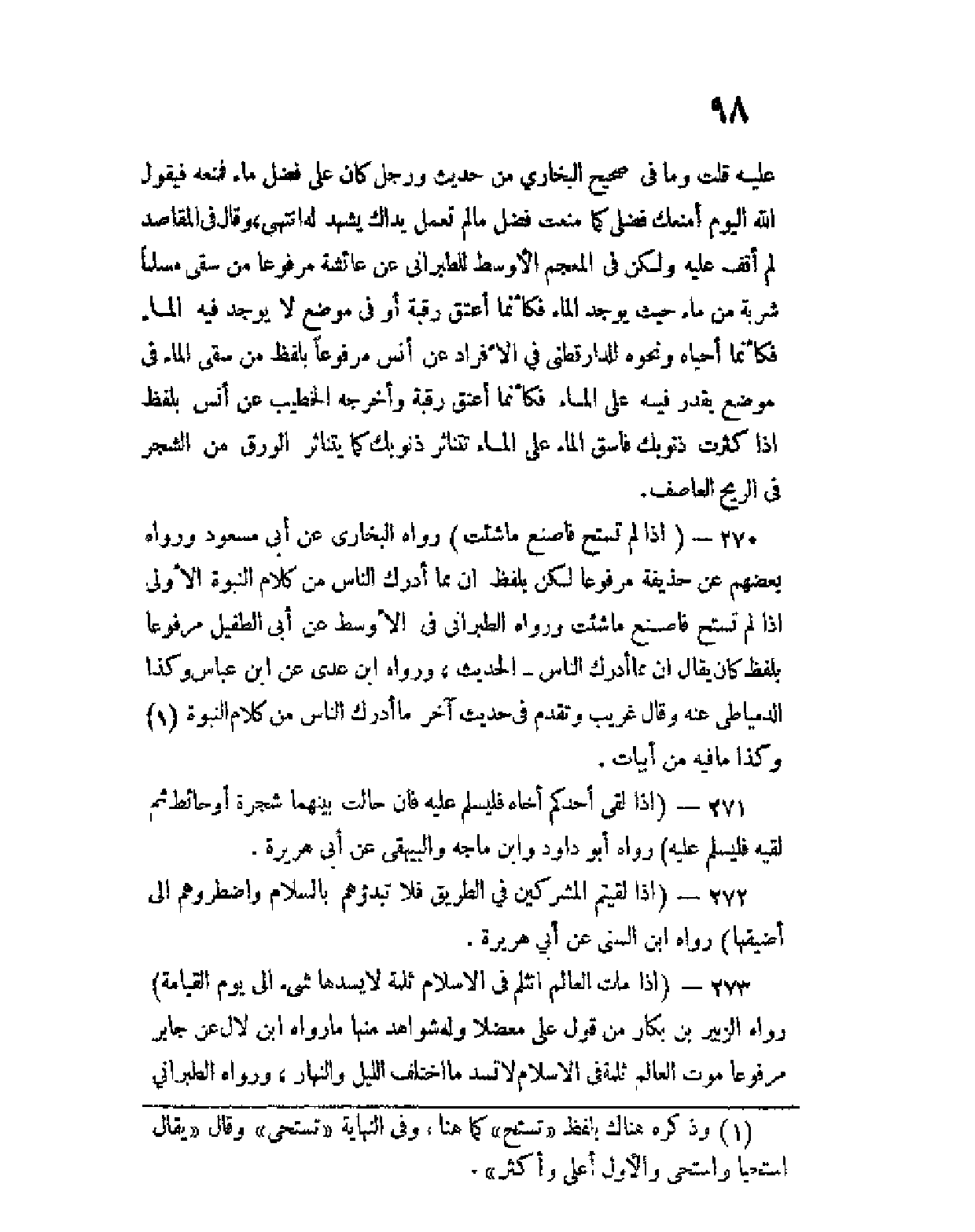 271 - (إذا لقي أحدُكم أخاه فلْيسلّم عليه فإن حالت بينهما شجرةٌ أو حائط ثم لقيه فلْيسلّم عليه) رواه أبو داود وابن ماجه والبيهقي عن أبي هريرة.